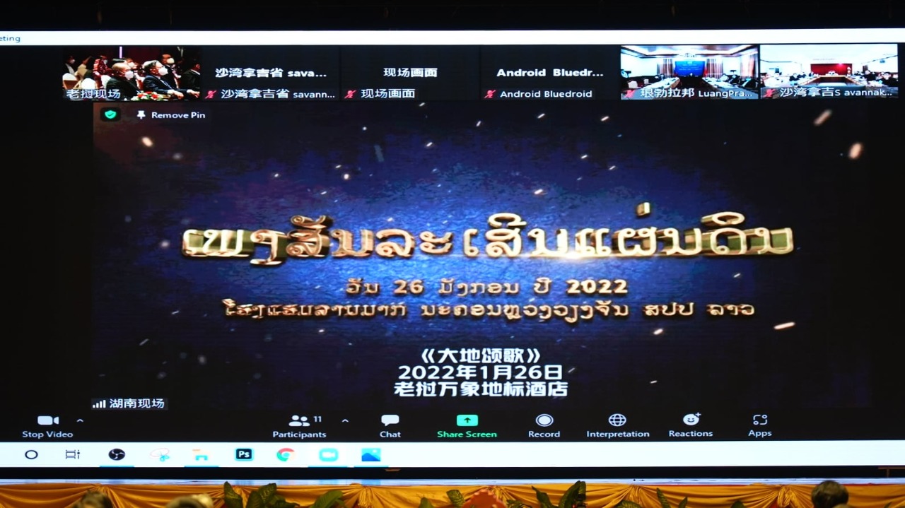 ໂດຍຄະນະໂຄສະອົບຮົມສູນກາງພັກ ປປ ລາວ, ຄະນະພົວພັນຕ່າງປະເທດສູນກາງພັກ ປປ ລາວ ພ້ອມດ້ວຍ ກະຊວງຖະແຫຼງຂ່າວ, ວັດທະນະທໍາ ແລະ ທ່ອງທ່ຽວ ແຫ່ງ ສປປ ລາວ ສົມທົບກັບ ຄະນະພັກແຂວງຫູນານ ຮ່ວມກັນຈັດສາຍຮູບເງົາລະຄອນເວທີການແກ້ໄຂຄວາມທຸກຍາກ “ເພງສັນລະເສີນແຜ່ນດິນ” (ຕ້າຕີ້ຊົງເກີ) ແລະ ພິທີມອບ-ຮັບເຄື່ອງຊ່ວຍເຫຼືອຕ້ານພະຍາດໂຄວິດ-19 ຜ່ານລະບົບວິດີໂອທາງໄກ, ວາລະດັ່ງກ່າວຈັດຂຶ້ນເມື່ອວັນທີ 26 ມັງກອນ 2022 ທີ່ນະຄອນຫຼວງວຽງຈັນ, ສປປ ລາວ ແລະ ທີ່ນະຄອນສາງຊາ, ແຂວງຫູນານ, ສປ ຈີນ.