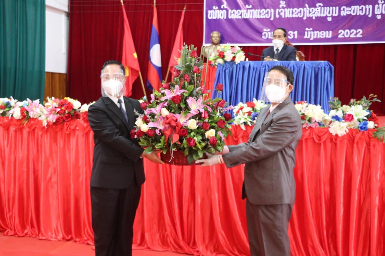 ສຳເລັດພິທີມອບ-ຮັບໜ້າທີ່ລະຫວ່າງ ສະຫາຍ ພົຕ ຄຳລຽງ ອຸທະໄກສອນ, ເລຂາພັກແຂວງ, ເຈົ້າແຂວງໄຊສົມບູນ ຜູ້ເກົ່າ ແລະ ສະຫາຍ ພອຍຄຳ ຮຸ່ງບຸນຍວງ ຮອງເລຂາພັກແຂວງ ຂຶ້ນເປັນເລຂາພັກແຂວງ, ເຈົ້າແຂວງໄຊສົມບູນ ຜູ້ໃໝ່, ເຂົ້າຮ່ວມໃນພິທີຊຶ່ງຈັດຂຶ້ນໃນວັນທີ 31 ມັງກອນ 2022 ໂດຍສະຫາຍ ບຸນທອງ ຈິດມະນີ ກຳມະການກົມການເມືອງສູນກາງພັກ, ຜູ້ປະຈຳການຄະນະເລຂາທິການສູນກາງພັກ, ຮອງປະທານປະເທດ, ມີບັນດາສະຫາຍຮອງລັດຖະມົນຕີ, ຮອງຫົວໜ້າຫ້ອງວ່າການສູນກາງພັກ, ຫົວໜ້າກົມ-ຮອງກົມຈາກສູນກາງ ພ້ອມດ້ວຍຄະນະພັກ-ຄະນະນຳແຂວງ, ການນຳທັງ 5 ເມືອງ ແລະ ພາກສ່ວນກ່ຽວຂ້ອງເຂົ້າຮ່ວມເປັນສັກຂີພິຍານ.