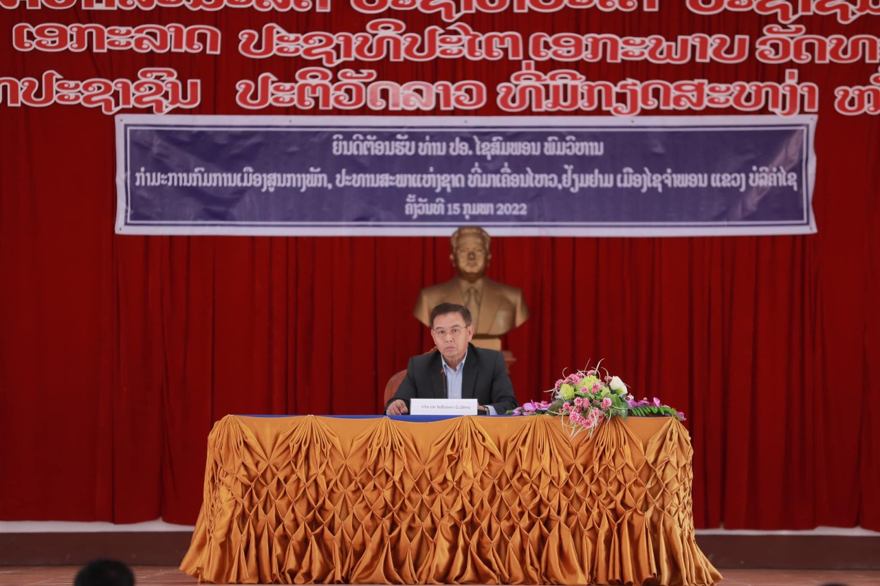 ທ່ານ ໄຊສົມພອນ ພົມວິຫານ ກໍາມະການກົມການເມືອງສູນກາງພັກ, ປະທານສະພາແຫ່ງຊາດ, ພ້ອມດ້ວຍຄະນະໄດ້ເຄື່ອນໄຫວຢ້ຽມຢາມ ແລະ ເຮັດວຽກຢູ່ເມືອງໄຊຈໍາພອນ ແຂວງບໍລິຄໍາໄຊ. ໃນໂອກາດນີ້, ທັງຄະນະໄດ້ຕິດຕາມເບິ່ງຫຼາຍໂຄງການພັດທະນາ ແລະນຳເອົາເຄື່ອງຊ່ວຍເຫຼືອໄປມອບໃຫ້ອີກດ້ວຍ. ໃຫ້ການຕ້ອນຮັບ ແລະ ເຄື່ອນໄຫວນຳຄະນະປະທານສະພາແຫ່ງຊາດ ເມື່ອວັນທີ 15 ກຸມພາ 2022, ໂດຍທ່ານ ກອງແກ້ວ ໄຊສົງຄາມ ກໍາມະການສູນກາງພັກ, ເຈົ້າແຂວງບໍລິຄຳໄຊ ແລະ ທ່ານ ສຸວັນນີ ໄຊຊະນະ ປະທານສະພາປະຊາຊົນແຂວງ, ພ້ອມດ້ວຍພະນັກງານກ່ຽວຂ້ອງ.