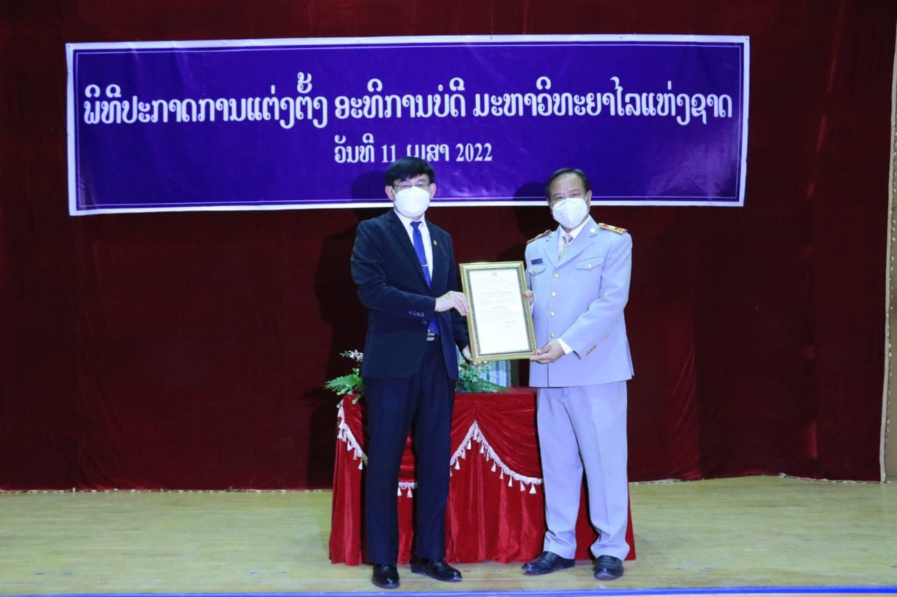 ທັງນີ້, ທ່ານ ອຸ່ນຄໍາ ອວນສະຫວັນ ຮອງຫົວໜ້າກົມຈັດຕັ້ງ ແລະພະນັກງານ ກະຊວງສຶກສາ ທິການ ແລະກີລາ, ໄດ້ຂຶ້ນຜ່ານດໍາລັດວ່າດ້ວຍການແຕ່ງຕັ້ງອະທິການບໍດີມະຫາວິທະຍາໄລແຫ່ງຊາດ ສະບັບເລກທີ 110/ນຍ, ລົງວັນທີ 23 ມີນາ 2022 ວ່າດ້ວຍການແຕ່ງຕັ້ງ ທ່ານ ອຸດົມ ພອນຄຳເພັງ ເປັນອະທິການບໍດີ ມະຫາວິທະຍາໄລແຫ່ງຊາດ.