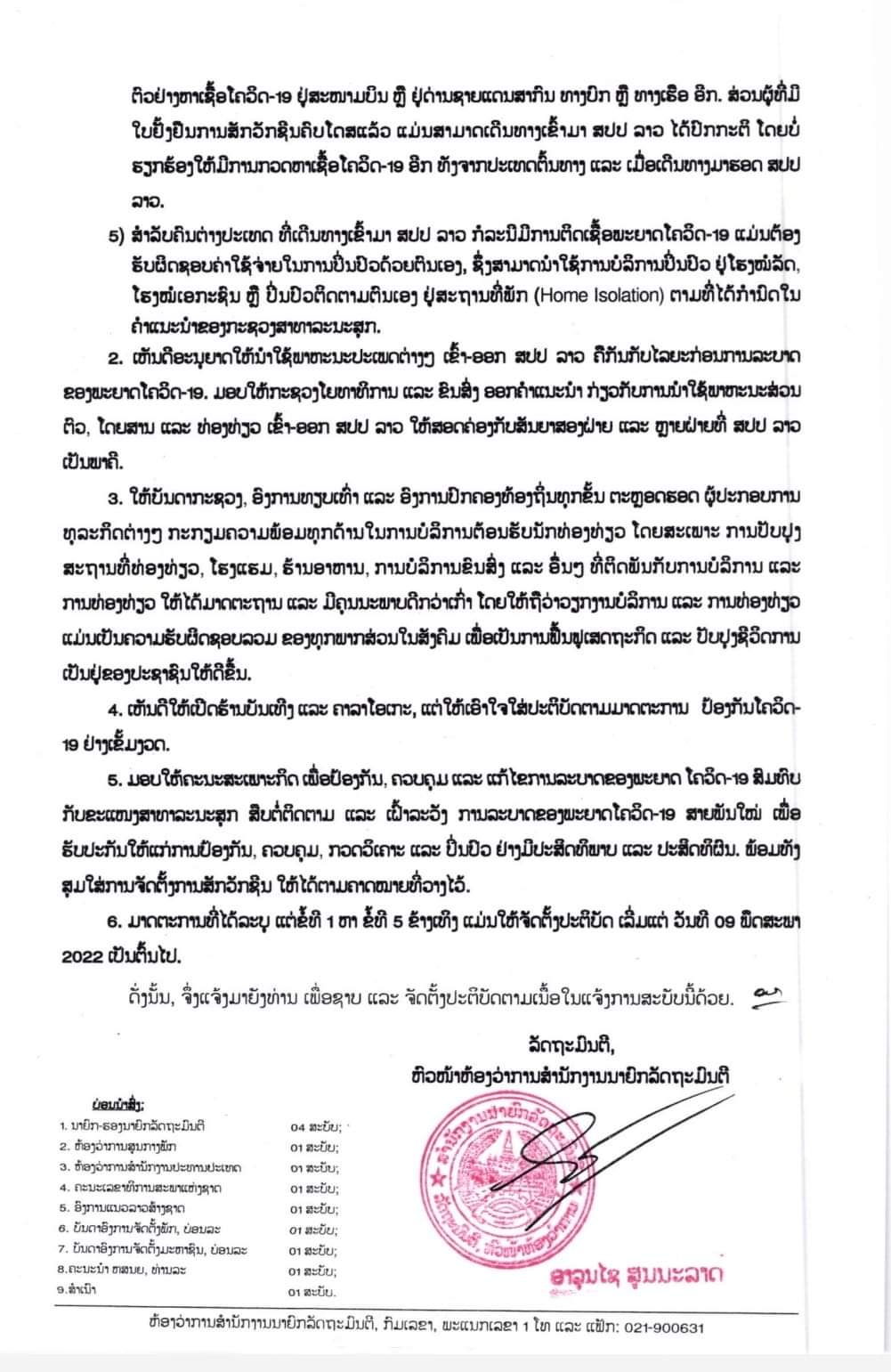 5. ສໍາລັບຄົນຕ່າງປະເທດ ທີ່ເດີນທາງເຂົ້າມາ ສປປ ລາວ ກໍລະນີມີການຕິດເຊື້ອພະຍາດໂຄວິດ-19 ແມ່ນຕ້ອງຮັບຜິດຊອບຄ່າໃຊ້ຈ່າຍໃນການປິ່ນປົວດ້ວຍຕົນເອງເຊິ່ງສາມາດນຳໃຊ້ການບໍລິການປິ່ນປົວຢູ່ໂຮງໝໍລັດ, ໂຮງໝໍເອກະຊົນ ຫລືປິ່ນປົວຕິດຕາມຕົນເອງຢູ່ສະຖານທີ່ພັກ (Home Isolation) ຕາມທີ່ໄດ້ກຳນົດໃນຄຳແນະນຳຂອງກະຊວງສາທາລະນະສຸກ.