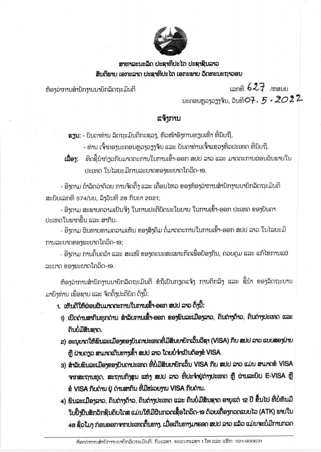 ອີງຕາມການທາບທາມຄວາມຄິດເຫັນຈາກທົ່ວສັງຄົມ ແລະອີງຕາມການຄົ້ນຄ້ວາ ແລະການສະເໜີຂອງຄະນະສະເພາະກິດເພື່ອຄວບຄຸມ ແລະແກ້ໄຂການແຜ່ລະບາດຂອງພະຍາດໂຄວິດ-19 ລັດຖະບານຈຶ່ງໄດ້ກຳນົດມາດຕະການ ເຂົ້າ-ອອກ ສປປ ລາວ ແລະມາດຕະການຜ່ອນຜັນພາຍໃນປະເທດໃນໄລຍະຍັງມີການລະບາດຂອງພະຍາດໂຄວິດ-19 ໂດຍມີແຈ້ງການສະບັບເລກທີ 627/ຫສນຍ, ລົງວັນທີ 07 ພຶດສະພາ 2022 ວ່າດ້ວຍການເຫັນດີຜ່ອນຜັນມາດຕະການໃນການເຂົ້າ-ອອກ ສປປ ລາວ ດັ່ງນີ້:
