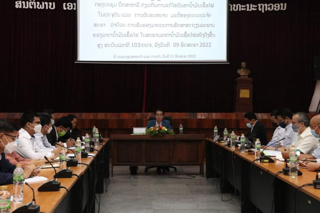 ກອງປະຊຸມປຶກສາຫາລືແກ້ໄຂບັນຫານໍ້າມັນເຊື້ອໄຟໃນປັດຈຸບັນ ແລະການຜັນຂະຫຍາຍມະຕິຄະນະປະຈໍາສະພາແຫ່ງຊາດວ່າດ້ວຍການຮັບຮອງມາດຕະການຮັກສາສະຖຽນລະພາບຂອງລາຄານໍ້າມັນເຊື້ອໄຟໃນສະພາບລາຄານໍ້າມັນເຊື້ອໄຟເໜັງຕີງຂຶ້ນສູງໄດ້ຈັດຂຶ້ນໃນວັນທີ 11 ພຶດສະພາ 2022 ໂດຍການເປັນປະທານຂອງທ່ານ ຄໍາແພງ ໄຊສົມແພງ ລັດຖະມົນຕີກະຊວງອຸດສາຫະກຳ ແລະການຄ້າ, ມີຕາງໜ້າບໍລິສັດນໍ້າມັນເຊື້ອໄຟ ແລະສະມາຄົມນໍ້າມັນເຊື້ອໄຟ ແລະອາຍແກັດລາວ ເຂົ້າຮ່ວມ.