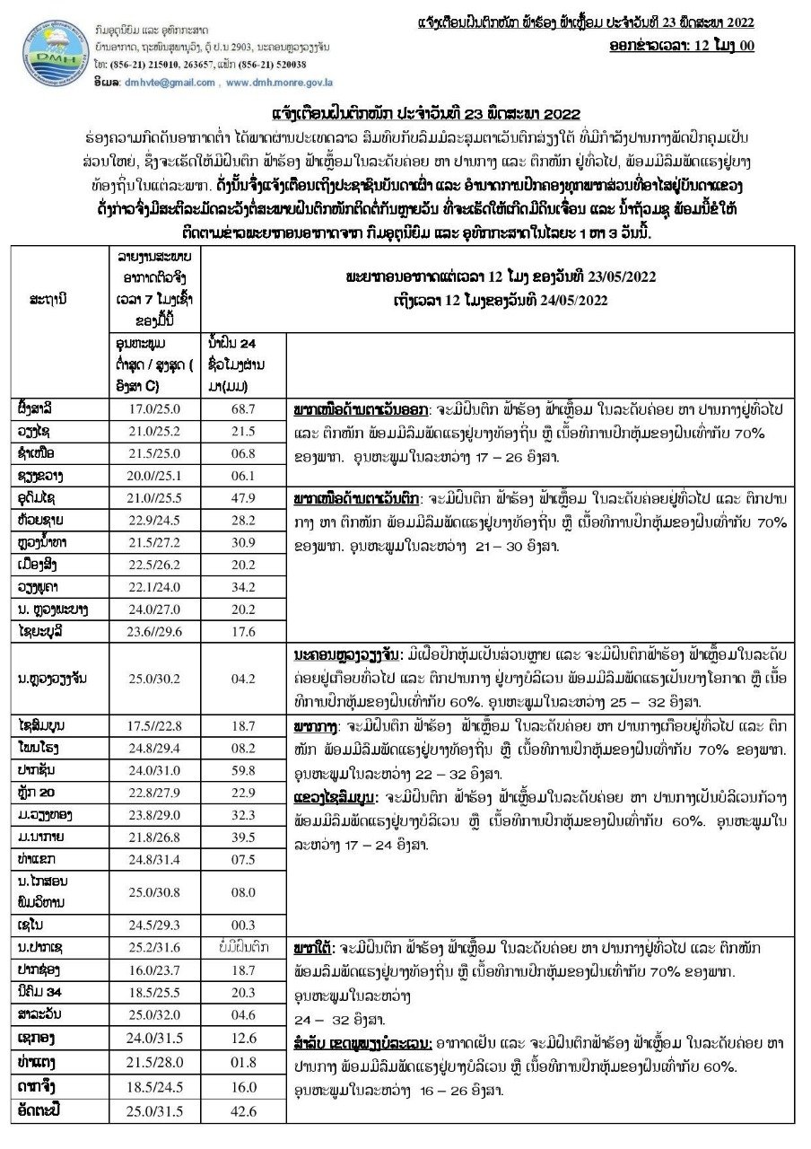 ພະຍາກອນອາກາດ ແຕ່ເວລາ 12:00 ໂມງຂອງວັນທີ 23 ພຶດສະພາ 2022 ເຖິງ ເວລາ 12:00 ໂມງ ວັນທີ 24 ພຶດສະພາ 2022