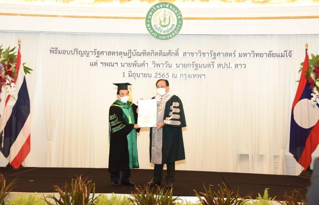 ໃນໂອກາດເດີນທາງໄປຢ້ຽມຢາມ ຣາຊະອານາຈັກໄທ ຢ່າງເປັນທາງການໃນລະຫວ່າງວັນທີ 1-2 ມິຖຸນາ 2022, ທ່ານ ພັນຄຳ ວິພາວັນ ນາຍົກລັດຖະມົນຕີ ແຫ່ງ ສປປ ລາວ ໄດ້ເຂົ້າຮັບປະລິນຍາ ດຸສະດີບັນດິດ ກິຕິມະສັກ ສາຂາວິຊາລັດຖະສາດ ຈາກມະຫາວິທະຍາ ໄລແມ່ໂຈ້ ຣາຊະອານາຈັກໄທ ໃນວັນທີ 1 ມິຖຸນາ ເນື່ອງຈາກທ່ານມີຜົນງານດີເດັ່ນໃນການບໍລິຫານ, ການພັດທະນາປະເທດຊາດ ໃນໄລຍະຜ່ານມາ ຊຶ່ງມອບໂດຍ ທ່ານ ວິລະພົນ ທອງມາ ອະທິການບໍດີ ມະຫາວິທະຍາໄລແມ່ໂຈ້ ຣາຊະອານາຈັກໄທ.
