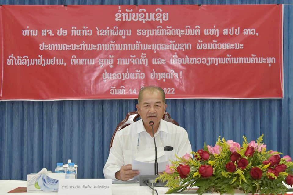 ໃນວັນທີ 14 ມິຖຸນາ 2022 ທ່ານ ກິແກ້ວ ໄຂຄໍາພິທູນ, ຮອງນາຍົກລັດຖະມົນຕີ, ປະທານຄະນະກຳມະການຕ້ານການຄ້າມະນຸດລະດັບຊາດພ້ອມດ້ວຍຄະນະໄດ້ເຄື່ອນໄຫວເຮັດວຽກ ແລະ ພົບປະໂອ້ລົມ ການນຳຫຼັກແຫຼ່ງ ແຂວງບໍ່ແກ້ວ ໂດຍໃຫ້ການຕ້ອນຮັບ ແລະເຂົ້າຮ່ວມຮັບຟັງການພົບປະໂອ້ລົມຂອງທ່ານ ບົວຄົງ ນາມມະວົງ, ເຈົ້າແຂວງໆບໍ່ແກ້ວ ພ້ອມດ້ວຍພະນັກງານການນໍາຫຼັກແຫຼ່ງຂອງແຂວງ.