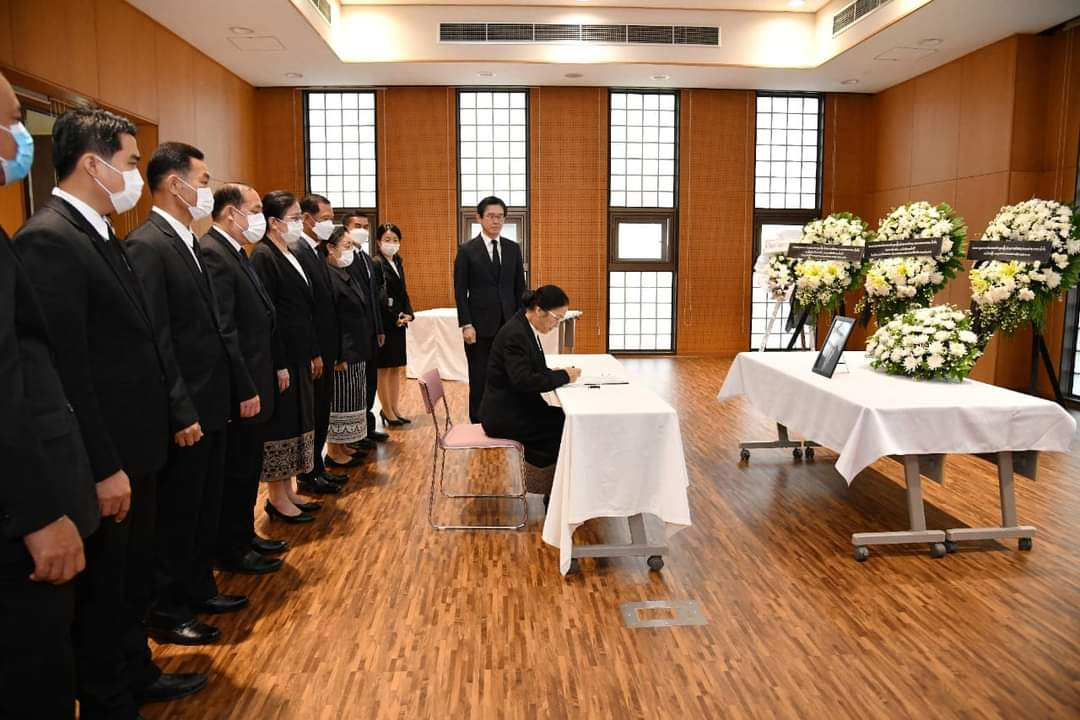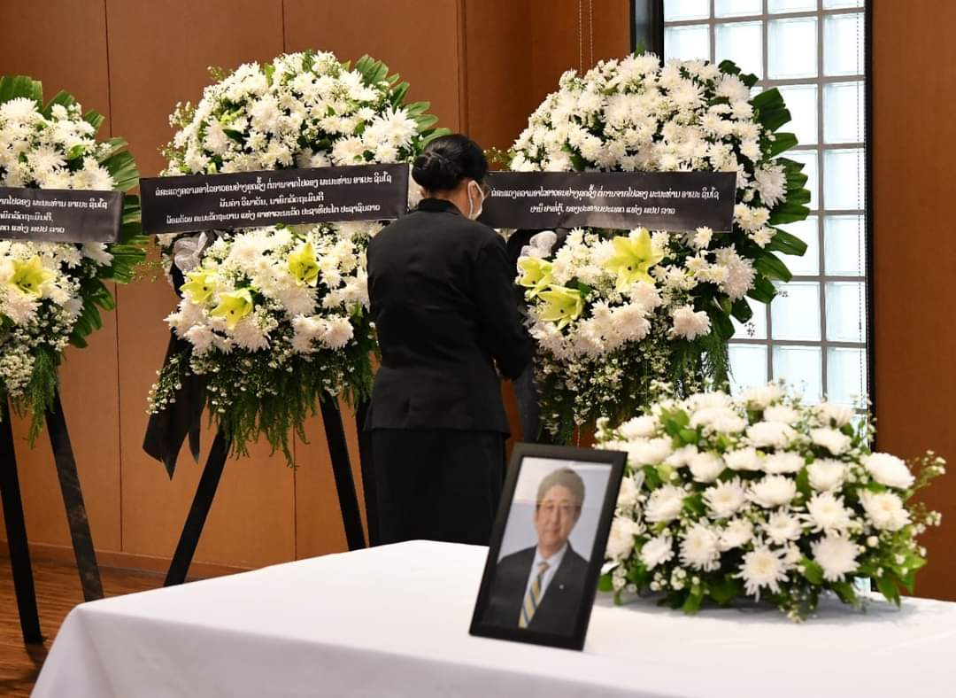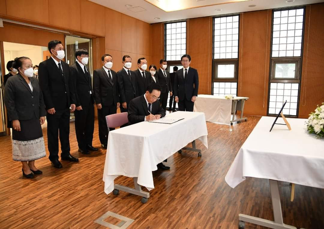 ໃນວັນທີ 12 ກໍລະກົດ 2022 ທີ່ ສະຖານທູດ ຍີ່ປຸ່ນ ປະຈຳ ສປປ ລາວ, ບັນດາການນຳຂັ້ນສູງຂອງ ສປປ ລາວ ໄດ້ເດີນ ທາງໄປເຂົ້າຮ່ວມພິທີວາງພວງມາລາ ແລະ ເຊັນປຶ້ມໄຫວ້ອາໄລຕໍ່ການເສຍຊີວິດຂອງພະນະ ທ່ານ ອາເບະ ຊິນໂຊ, ອະດີດນາຍົກລັດຖະມົນຕີ ແຫ່ງ ປະເທດຍີ່ປຸ່ນ, ເຂົ້າຮ່ວມພິທີໃນຄັ້ງນີ້ ມີ: ພະນະ ທ່ານ ນາງ ປານີ ຢາທໍ່ຕູ້, ຮອງປະທານປະເທດ; ພະນະທ່ານ ພັນຄຳ ວິພາວັນ, ນາຍົກລັດຖະມົນຕີ ແລະ ພະນະທ່ານ ສະເຫຼີມໄຊ ກົມມະສິດ, ຮອງນາຍົກລັດຖະມົນຕີ, ລັດຖະມົນຕີກະຊວງການຕ່າງປະເທດ ແຫ່ງ ສປປ ລາວ ຕາມລຳດັບ, ເຊິ່ງເນື້ອໃນການເຊັນປຶ້ມໄຫວ້ອາໄລ ມີຄືດັ່ງນີ້: