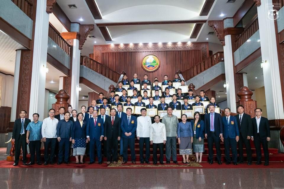 ຕອນບ່າຍວັນທີ 19 ກໍລະກົດ 2022 ຢູ່ທີ່ ຫ້ອງວ່າການສຳນັກງານນາຍົກລັດຖະມົນຕີ, ໄດ້ມີພິທີປະດັບຫຼຽນໄຊແຮງງານຊັ້ນ II ຄະນະນຳ, ຄະນະຄູຝຶກ ແລະນັກກິລາ ທີມຊາດລາວ ຮຸ່ນອາຍຸບໍ່ເກີນ 19 ປີ ໄດ້ ຮອງແຊ້ມ ການແຂ່ງຂັນບານເຕະຊາຍຊີງແຊ້ມອາຊຽນ ຮຸ່ນອາຍຸບໍ່ເກີນ 19 ປີ ຢູ່ທີ່ປະເທດອິນໂດເນເຊຍ, ເຂົ້າຮ່ວມໃນພິທີດັ່ງກ່າວໂດຍມີທ່ານ ພັນຄຳ ວິພາວັນ ນາຍົກລັດຖະມົນຕີແຫ່ງ ສປປ ລາວ, ທ່ານ ພຸດ ສິມມາລາວົງ ລັດຖະມົນຕີກະຊວງສຶກສາທິການ ແລະກິລາ, ທ່ານ ວີເພັດ ສີຫາຈັກຣ ປະທານສະຫະພັນບານເຕະແຫ່ງຊາດລາວ, ຄະນະບໍລິຫານງານສະຫະພັນບານເຕະແຫ່ງຊາດລາວ, ຄະນະນຳ, ຄະນະຄູຝຶກ ແລະນັກກິລາ ທີມຊາດລາວ ຮຸ່ນອາຍຸບໍ່ເກີນ 19 ປີ ພ້ອມດ້ວຍພາກສ່ວນທີ່ກ່ຽວຂ້ອງ ແລະສື່ມວນຊົນເຂົ້າຮ່ວມ.