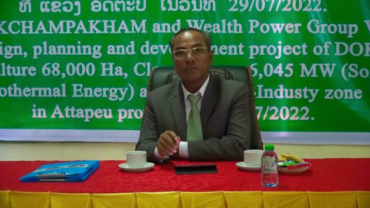 ພິທີເຊັນສັນຍາຮ່ວມມືການສໍາຫຼວດອອກແບບວາງແຜນ ແລະພັດທະນາໂຄງການດ້ານກະສິກຳສະອາດ, ພະລັງງານສະອາດ ແລະ ເຂດເສດຖະກິດອຸດສະຫະກໍາຊື່ງທັງໝົດເປັນໂຄງການຂອງບໍລີສັດດອກຈໍາປາຄໍາຢູ່ແຂວງອັດຕະປືເມື່ອວັນທີ 29 ກໍລະກົດ 2022 ນີ້ທີ່ໂຮງແຮມດອກຈໍາປາແຂວງອັດຕະປື ໄດ້ມີພິທີເຊັນສັນຍາຮ່ວມມື,ກ່ຽວກັບການສໍາຫຼວດອອກແບບ,ວາງແຜນ ແລະ ພັດທະນາໂຄງການດ້ານກະສິກຳສະອາດ,ພະລັງງານສະອາດ ແລະ ເຂດເສດຖະກິດອຸດສະຫະກໍາ ລະຫວ່າງ ບໍລິສັດ ດອກຈໍາປາຄໍາ (DOKCHAMPAKHAM) ສປປ ລາວ ກັບບໍລິສັດ ແວວພາວເວີ ກຣຸບ (Wealth Power Group) ຈາກ ສສ.ຫວຽດນາມ,ໂດຍເປັນກຽດເຂົ້າຮ່ວມມີທ່ານ ເລັດ ໄຊຍະພອນ ເຈົ້າແຂວງອັດຕະປື,ມີທ່ານ ຫວັດສະດີ ຂຸມເພັດຊະວົງ ປະທານບໍລິສັດ ດອກຈໍາປາຄໍາ,ມີທ່ານ ຫງ່ຽນ ວັນກຸ໋ຍງ໋ອກປະທານ ບໍລິສັດ ແວວຟາວເວີກຣູບ ພ້ອມດ້ວຍຄະນະນໍາຂອງແຂວງ, ບັນດາທ່ານເຈົ້າເມືອງ ແລະພາກສ່ວນທີ່ກ່ຽວຂ້ອງເຂົ້າຮ່ວມ.