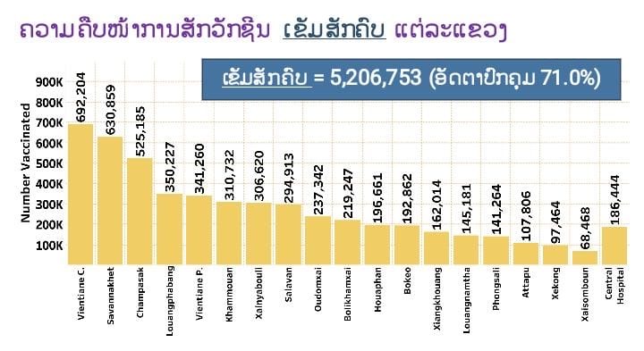 ສຳລັບຕົວເລກການຕິດເຊື້ອພະຍາດໂຄວິດ-19 ຢູ່ປະເທດລາວເຮົາ ມາຮອດວັນທີ 28 ກໍລະກົດ 2022 ທົ່ວປະເທດມີຜູ້ຕິດເຊື້ອທົງໝົດ 211.061 ກໍລະນີ (ພາຍໃນ 194.988 ກໍລະນີ ແລະນຳເຂົ້າ 16.063 ກໍລະນີ), ສ່ວນອັດຕາການສັກວັກຊິນເຂັມທີ1 ມີທັງໝົດ 5,87 ລ້ານຄົນ ເທົ່າກັບ 80,1%, ເຂັມຄສັກຄົບ 5,2ລ້ານຄົນ ເທົ່າກັບ 71%.