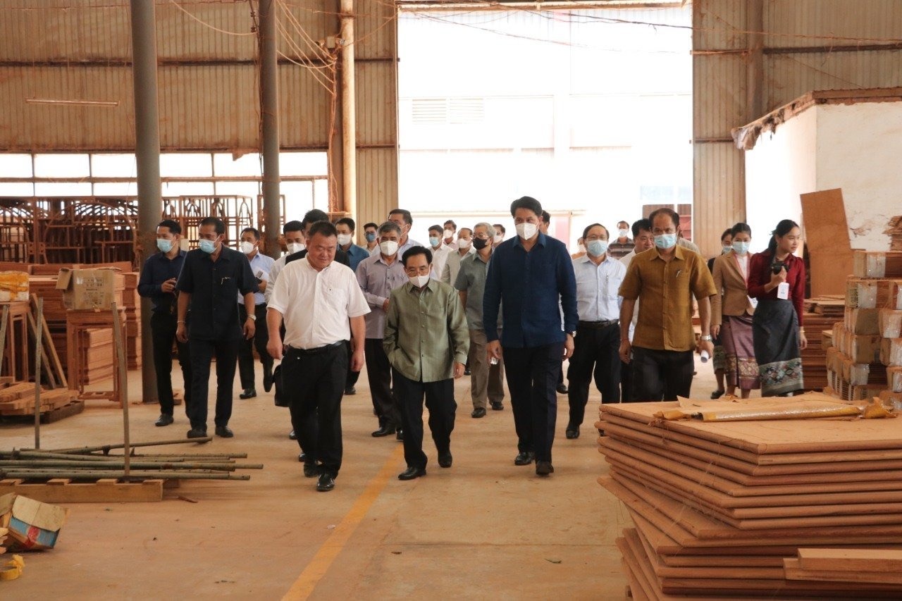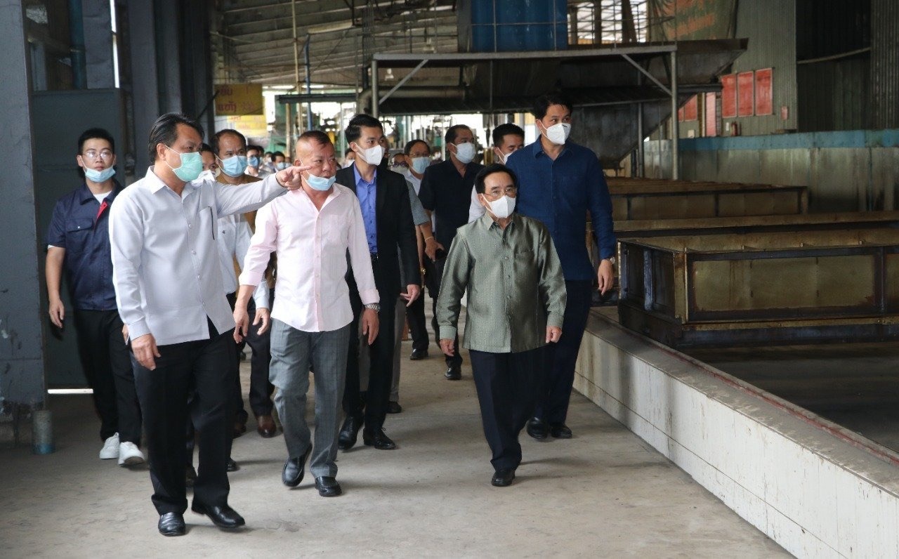 ພາຍຫລັງສຳເລັດການພົບປະໂອ້ລົມພະນັກງານການນຳຂອງແຂວງທີ່ຫ້ອງວ່າ ການແຂວງແລ້ວ, ທ່ານນາຍົກລັດຖະມົນຕີ ພ້ອມດ້ວຍຄະນະ ແລະ ການນໍາແຂວງໄດ້ສືບຕໍ່ລົງຢ້ຽມຢາມໂຮງງານປຸງແຕ່ງນໍ້າຢາງພາລາຂອງບໍລິສັດ ຈົງອູ ໄດ້ຮັບຟັງການລາຍງານສະພາບກ່ຽວກັບການຈັດຕັ້ງປະຕິບັດວຽກງານຂອງໂຮງງານເປັນຕົ້ນລາຄາການເກັບຊື້ຢາງ, ການຜະລິດ ແລະການສົ່ງອອກ; ຢ້ຽມຢາມ ໂຮງງານເຟີນີເຈີ ບໍລິສັດ ຊວງໄຊ ທີ່ບ້ານກໍນ້ອຍ ຊຶ່ງມີທ່ານ ຈັງເອີ ພ້ອມດ້ວຍພະນັກງານໃຫ້ການຕ້ອນຮັບພ້ອມທັງນຳພາໃນການຢ້ຽມຊົມການຜະລິດເຟີນີເຈີ ພາຍໃນໂຮງງານ ແລະບາງກິດຈະກຳຂອງບໍລິສັດກໍຄືການສົ່ງເສີມປະຊາຊົນປູກມອນ-ລ້ຽງມ້ອນ.