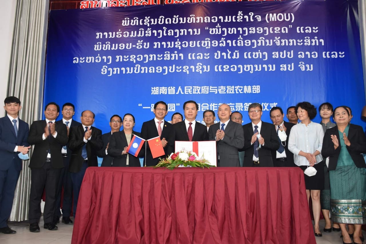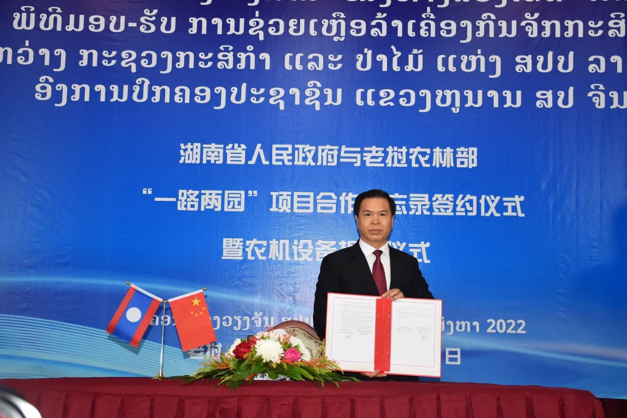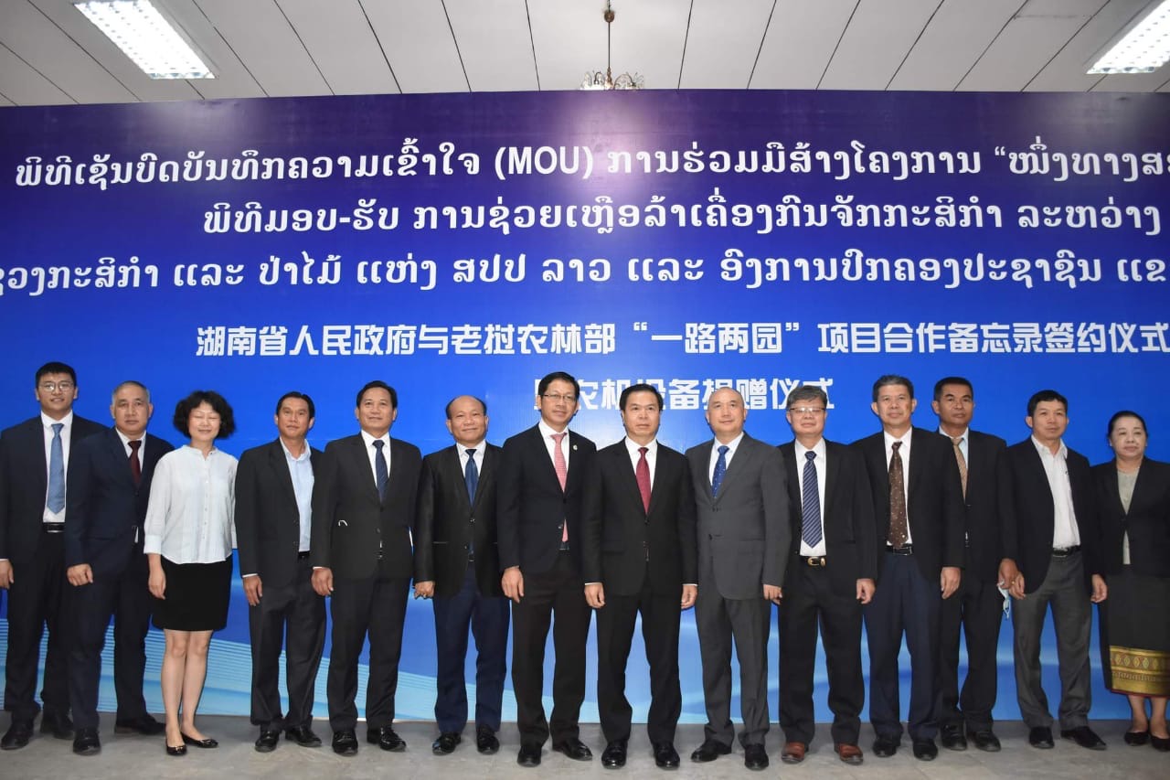 ວັນທີ 26 ສິງຫາ ຜ່ານມາ ທີ່ນະຄອນຫຼວງວຽງຈັນ ໄດ້ມີພິທີເຊັນບົດບັນທຶກຄວາມເຂົ້າໃຈ ການຮ່ວມມືສ້າງໂຄງການ “ໜຶ່ງທາງ ສອງເຂດ” ແລະພິທີມອບ-ຮັບ ການຊ່ວຍເຫຼືອລ້າເຄື່ອງກົນຈັກກະສິກຳ ລະຫວ່າງກະຊວງກະສິກໍາ ແລະ ປ່າໄມ້ ສປປ ລາວ ແລະ ອົງການປົກຄອງປະຊາຊົນແຂວງຫູໜານ ສປ ຈີນ ຮ່ວມລົງນາມໂດຍທ່ານ ກິແກ້ວ ສິງນາວົງ ຮອງລັດຖະມົນຕີກະຊວງກະສິກຳ ແລະປ່າໄມ້ ແລະທ່ານ ເຮີ ເບົ້າສຽງ ຮອງເຈົ້າແຂວງອົງການປົກຄອງປະຊາຊົນແຂວງຫູໜານມີທ່ານ ເພັດ ພົມພິພັກ ລັດຖະມົນຕີກະຊວງກະສິກຳ ແລະປ່າໄມ້ ສປປ ລາວ ທ່ານ Mao Wei Ming ເຈົ້າແຂວງອົງການປົກຄອງປະຊາຊົນແຂວງຫູໜານ ສປ ຈີນ ທ່ານນາງ ຄໍາເພົາ ເອີນທະວັນ ເອກອັກຄະລັດຖະທູດແຫ່ງ ສປປ ລາວ ປະຈໍາ ສປ ຈີນ ພ້ອມດ້ວຍພາກສ່ວນກ່ຽວຂ້ອງສອງຝ່າຍເຂົ້າຮ່ວມ.