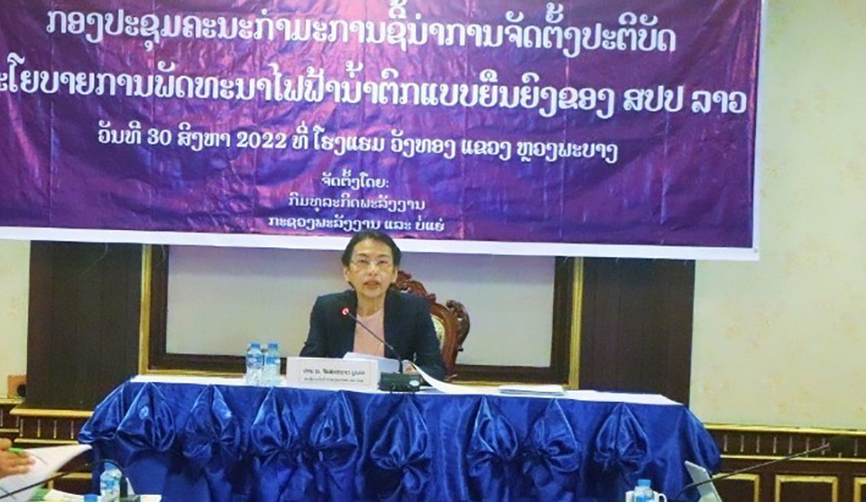 ກະຊວງພະລັງງານ ແລະບໍ່ແຮ່ ຈັດກອງປະຊຸມຄະນະກຳມະການການຊີ້ນໍາການຈັດຕັ້ງປະຕິບັດນະໂຍບາຍການພັດທະນາໄຟຟ້ານໍ້າຕົກແບບຍືນຍົງຂອງ ສປປ ລາວ ໃນວັນທີ 30 ສິງຫາ 2022 ທີ່ແຂວງຫລວງພະບາງເພື່ອປຶກສາຫາລື ແລະປະກອບຄຳເຫັນຖອດຖອນບົດຮຽນກ່ຽວກັບການຈັດຕັ້ງປະຕິບັດນະໂຍບາຍພັດທະນາໄຟຟ້ານໍ້າຕົກແບບຍືນຍົງໄລຍະຜ່ານມາຂອງກົມນະໂຍບາຍ ແລະແຜນພະລັງງານທີ່ຈະມອບໃຫ້ກົມທຸລະກິດພະລັງງານເປັນຜູ້ຈັດຕັ້ງປະຕິບັດຕາມພາລະບົດບາດໃໝ່.