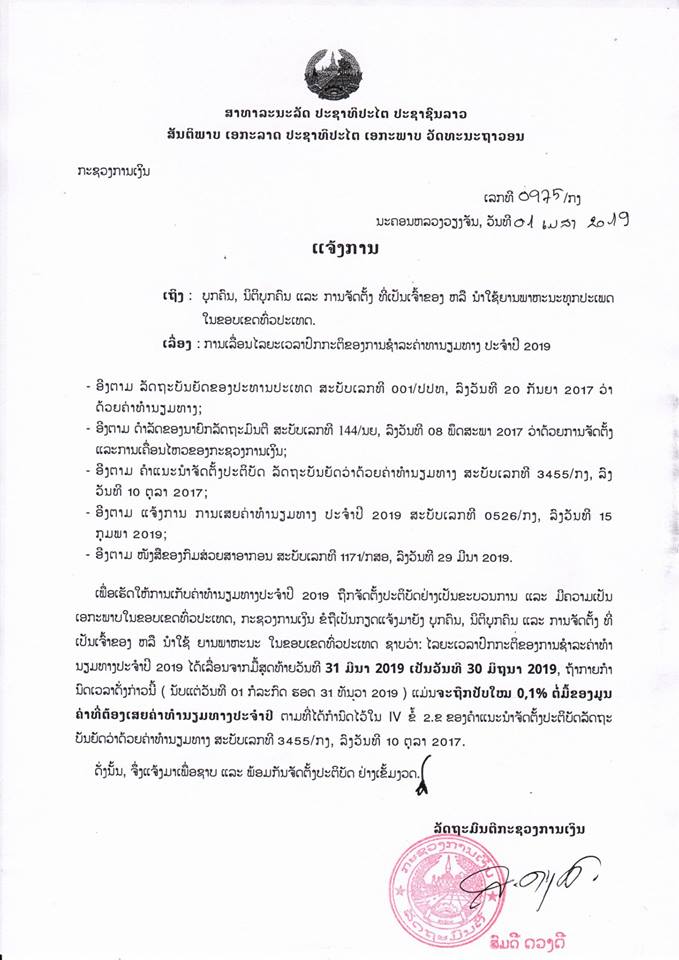 ໃນແຈ້ງການຂອງກະຊວງການເງິນທີ່ໄດ້ອອກແຈ້ງການໄປໃນວັນທີ 1 ເມສາຜ່ານມານັ້ນ, ໄດ້ລະບຸຈະແຈ້ງເຖິງບັນດາບຸກຄົນ, ນິຕິບຸກຄົນ ແລະການຈັດຕັ້ງ ທີ່ເປັນເຈົ້າຂອງຫຼືນຳໃຊ້ຍານພາຫະນະທຸກປະເພດໃນຂອບເຂດທົ່ວປະເທດໃຫ້ເຂົ້າໃຈ ແລະສືບຕໍ່ມາຊຳລະຄ່າທຳນຽມທາງຕື່ມຈົນກວ່າຈະສິ້ນສຸດໃນທ້າຍເດືອນມິຖຸນາ, ທັງນີ້ກໍເພື່ອເຮັດໃຫ້ການເກັບຄ່າທຳນຽມທາງປະຈຳປີ 2019 ຖືກຈັດຕັ້ງປະຕິບັດຢ່າງເປັນຂວນການ ແລະມີຄວາມເປັນເອກະພາບໃນຂອບເຂດທົ່ວປະເທດ, ສະນັ້ນກະຊວງການເງິນຈຶ່ງໄດ້ອອກແຈ້ງການສະບັບນີ້ເພື່ອໃຫ້ຜູ້້ຊົມໃຊ້ລົດທຸກປະເພດຮັບຮູ້ວ່າກະຊວງໄດ້ເລື່ອນໄລຍະເວລາປົກກະຕິຂອງການຊຳລະຄ່າທຳນຽມທາງປະຈຳປີ 2019 ຈາກວັນທີ 31 ມີນາ ເປັນວັນທີ 30 ມິຖຸນາ 2019 ຖ້າຫາກວ່າບັນດາບຸກຄົນ,ນິຕິບຸກຄົນ ແລະ ການຈັດຕັ້ງທີ່ເປັນເຈົ້າຂອ ງຫຼືນຳໃຊ້ຍານພາຫະນະທຸກປະເພດໃນຂອບເຂດທົ່ວປະເທດບໍ່ມາຊຳລະຕາມກຳນົດເວລາດັ່ງນັ້ນ (ນັບແຕ່ວັນທີ 1 ກໍລະກົດ -31 ທັນວາ 2019) ແມ່ນຈະຖືກປັບໃໝ 0,1% ຕໍ່ວັນຂອງມູນຄ່າທີ່ຕ້ອງເສຍຄ່າທຳນຽມທາງປະຈຳປີຕາມທີ່ໄດ້ກຳນົດໄວ້ໃນ VI ຂໍ້ 2.2 ຂອງຄຳແນະນຳຈັດຕັ້ງປະຕິບັດລັດຖະບັນຍັດວ່າດ້ວຍຄ່າທຳນຽມທາງສະບັບເລກທີ 3455/ກງ, ລົງວັນທີ 10 ຕຸລາ 2017.