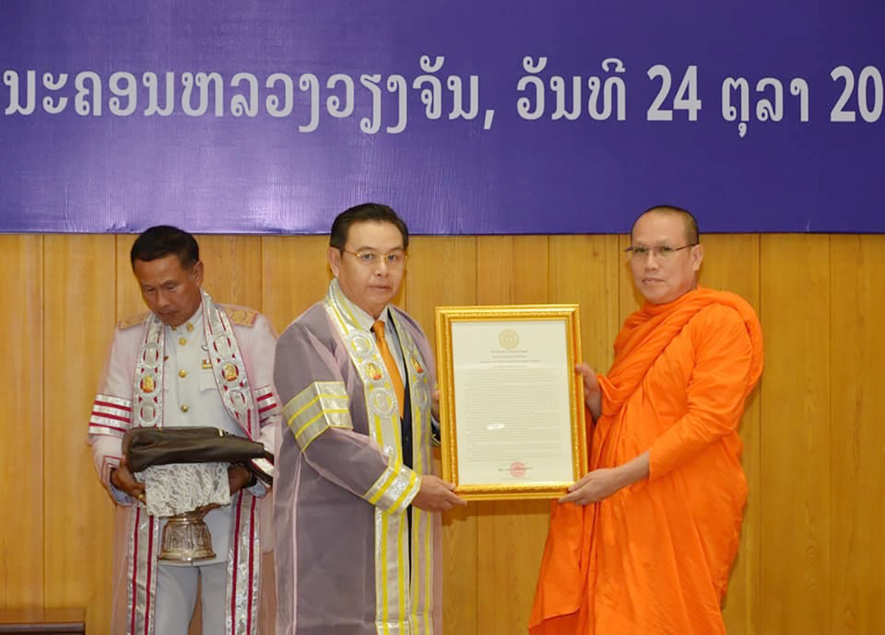 ພິທີມອບປະລິນຍາ ດຸສະດິບັນດິດ ກິດຕິມະສັກ ສາຂາພຸດທະສາສະໜາ ໂດຍມະຫາວິທະຍາໄລມະຫາຈຸລາລົງກອນ ຣາຊະວິທະຍາໄລ ແຫ່ງຣາຊະອານາຈັກໄທ ແດ່ທ່ານ ໄຊສົມພອນ ພົມວິຫານ ປະທານສະພາແຫ່ງຊາດ ແຫ່ງ ສປປ ລາວ ຈັດຂຶ້ນໃນວັນທີ 24 ຕຸລາ 2022 ທີ່ຫໍສະພາແຫ່ງຊາດ, ມີພາກສ່ວນທີ່ກ່ຽວຂ້ອງທັງຈາກ ຣາຊະອານາຈັກໄທ ແລະ ສປປ ລາວ ເຂົ້າຮ່ວມ.