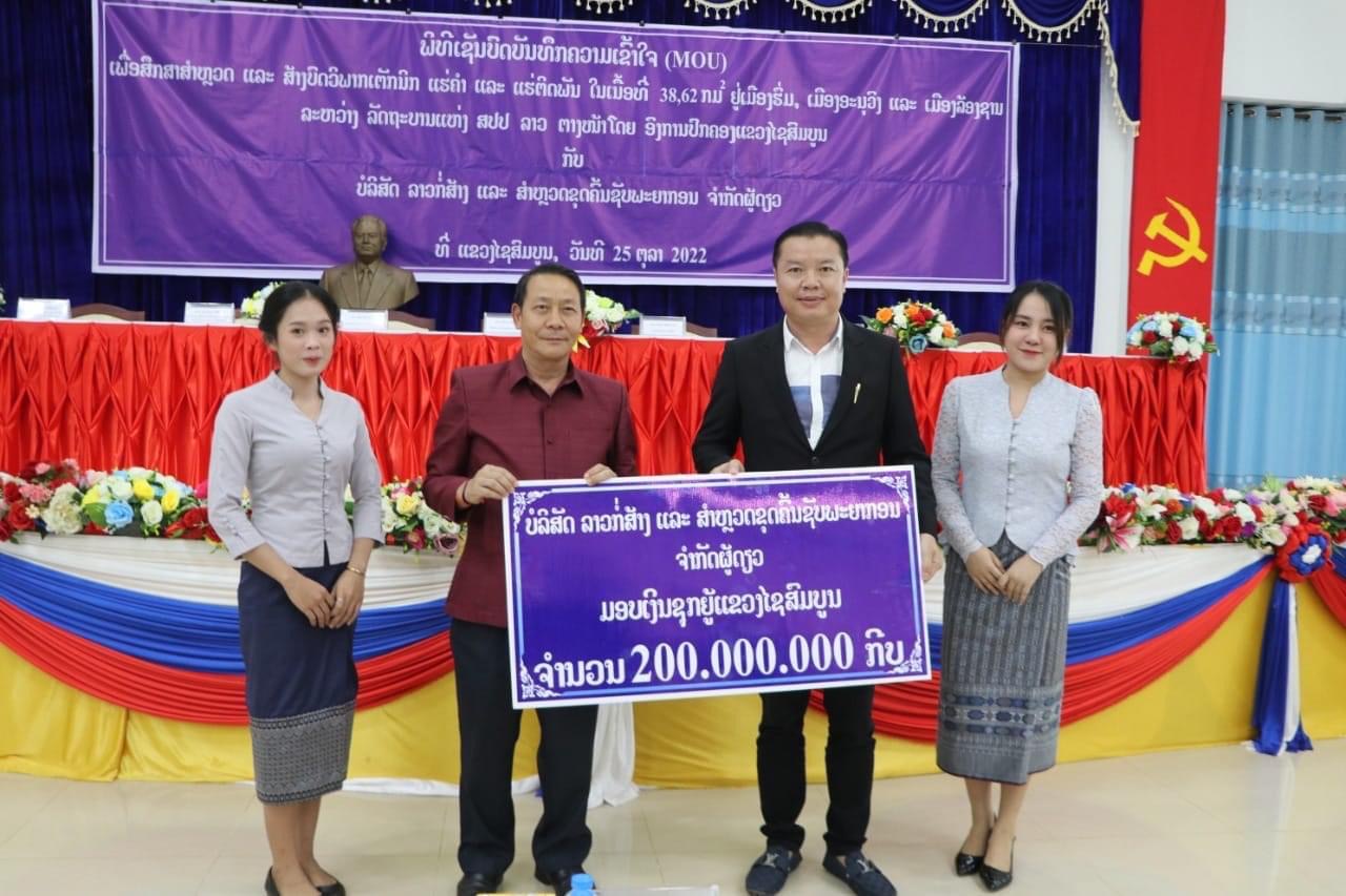 ຈາກນັ້ນໄດ້ມີພິທີລົງນາມເຊັນບົດບັນທຶກຄວາມເຂົ້າໃຈຢ່າງເປັນທາງການຊຶ່ງຕາງໜ້າໃຫ້ແກ່ອົງການປົກຄອງ ແຂວງໄຊສົມບູນ ໂດຍພະແນກແຜນການ ແລະການລົງທຶນເປັນຕົວແທນເຊັນບົດບັນທຶກຄວາມເຂົ້າໃຈ MOU ກັບບໍລິສັດລາວກໍ່ສ້າງແລະ ສຳຫຼວດຂຸດຄົ້ນຊັບພະຍາກອນ ຈຳກັດຜູ້ດຽວ ເຊັນເປັນພະຍານໂດຍພະແນກພະລັງງານ ແລະບໍ່ແຮ່, ເມືອງອະນຸວົງ, ເມືອງຮົ່ມ ແລະເມືອງລ້ອງຊານ ໂດຍຊ້ອງໜ້າແຂກທີ່ເຂົ້າຮ່ວມເປັນສັກຂີພິຍານ. ໃນຕອນທ້າຍບໍລິສັດລາວກໍ່ສ້າງແລະ ສຳຫລວດຂຸດຄົ້ນຊັບພະຍາກອນຈຳກັດຜູ້ດຽວໄດ້ປະກອບສ່ວນມອບເງິນຊຸກຍູ້ໃຫ້ແຂວງອີກຈຳນວນ 200 ລ້ານກີບ ເພື່ອນຳໃຊ້ເຄື່ອນໄຫວວຽກງານຕ່າງໆ ໃນການພັດທະນາແຂວງໄຊສົມບູນໃຫ້ໄດ້ຮັບການພັດທະນາຂຶ້ນຢ່າງບໍ່ຢຸດຢັ້ງ.