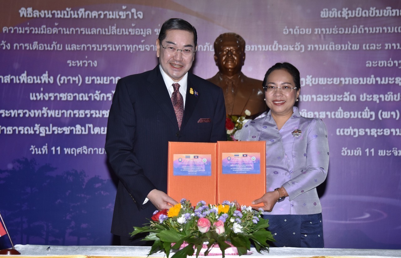 ໃນວັນທີ 11 ພະຈິກ 2022 ທີ່ກະຊວງຊັບພະຍາກອນທຳມະຊາດ ແລະ ສິ່ງແວດລ້ອມ ໄດ້ມີພິທິເຊັນບົດບັນທຶກຄວາມເຂົ້າໃຈ (MOU) ວ່າດ້ວຍການຮ່ວມມື ດ້ານການແລກປ່ຽນຂໍ້ມູນຂ່າວສານເຝົ້າລະວັງເຕືອນໄພ ແລະການບັນເທົາທຸກຈາກບັນຫາອຸທົກກະໄພລະຫວ່າງກະຊວງຊັບພະຍາກອນທໍາມະຊາດ ແລະສິ່ງແວດລ້ອມ ສປປ ລາວ ແລະ ມູນນິທິອາສາເພື່ອນເພິ່ງ (ພາ) ຍາມຍາກ ສະພາກາຊາດໄທ ແຫ່ງ ຣາຊະອານາຈັກໄທ. ຕາງໜ້າ ກະຊວງຊັບພະຍາກອນທໍາມະຊາດ ແລະສິ່ງແວດລ້ອມໃຫ້ກຽດລົງນາມ ໃນບົດບັນທຶກຄວາມເຂົ້າໃຈໃນຄັ້ງນີ້ແມ່ນທ່ານ ນາງ ບຸນຄຳ ວໍລະຈິດ ລັດຖະມົນຕີກະຊວງຊັບພະຍາກອນທຳມະຊາດ ແລະສິ່ງແວດລ້ອມຝ່າຍມູນນິທິອາສາເພື່ອນເພິ່ງ (ພາ) ຍາມຍາກສະພາກາຊາດໄທແມ່ນ ທ່ານ ສາດສະດາຈານພິເສດ ສຸຣະກຽດ ສະຖຽນໄທ ຮອງປະທານກຳມະການທີ່ປຶກສາ ແລະປະທານກຳມະການບໍລິຫານ ມູນນິທິອາສາເພື່ອນເພິ່ງ (ພາ) ຍາມຍາກ ສະພາກາຊາດໄທ ພ້ອມດ້ວຍພາກສ່ວນກ່ຽວຂ້ອງເຂົ້າຮ່ວມ.