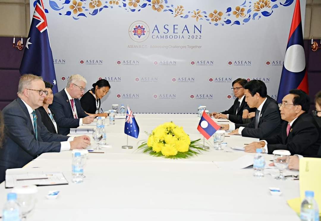 ໃນໂອກາດເຂົ້າຮ່ວມກອງປະຊຸມສຸດຍອດອາຊຽນ ຄັ້ງທີ 40 ແລະ 41 ແລະກອງປະຊຸມສຸດຍອດທີ່ກ່ຽວຂ້ອງທີ່ນະຄອນຫຼວງພະນົມເປັນ, ຣາຊະອານາຈັກ ກໍາປູເຈຍ, ທ່ານ ພັນຄໍາ ວິພາວັນ, ນາຍົກລັດຖະມົນຕີ ແຫ່ງ ສປປ ລາວ ໄດ້ພົບປະສອງຝ່າຍກັບ ທ່ານ ແອນໂທນີ້ ແອວບານີຊີ (Anthony Albanese), ນາຍົກລັດຖະມົນຕີ ແຫ່ງ ອົດສະຕຣາລີ ໃນຕອນເຊົ້າຂອງວັນທີ 12 ພະຈິກຜ່ານມາທີ່ໂຮງແຮມ ໂຊກາ, ພະນົມເປັນ.
