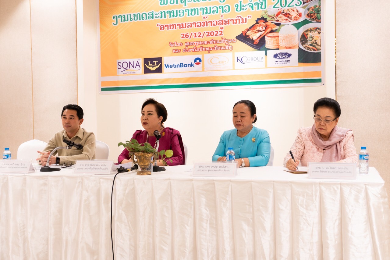 ພິທີຖະແຫລງຂ່າວງານເທສະການອາຫານລາວປະຈຳປີ 2023 ພາຍໃຕ້ຄໍາຂວັນ: “ເທດສະການອາຫານລາວກ້າວສູ່ສາກົນ (Promoting Lao to International recognition), ຈັດຂຶ້ນໃນວັນທີ 26 ທັນວາ 2022 ໂດຍສູນກາງສະຫະພັນແມ່ຍິງລາວ ແລະ ສະມາຄົມນັກທຸລາວກິດແມ່ຍິງ, ໂດຍການເຂົ້າຮ່ວມຂອງທ່ານ ມະໂນ ທອງວົງໄຊ ຮອງລັດຖະມົນຕີ ກະຊວງອຸດສາຫະກຳ ແລະການຄ້າ, ທ່ານ ນາງ ລາວັນ ສຸດທິສານ ຮອງປະທານຄະນະບໍລິຫານງານ ສູນກາງສະຫະພັນແມ່ຍິງລາວ ແລະ ທ່ານ ດາວວັນ ພະຈັນທະວົງ ຮອງປະທານ ສະພາການຄ້າ ແລະ ອຸດສາຫະກຳແຫ່ງຊາດ ພ້ອມພາກສ່ວນກ່ຽວຂ້ອງເຂົ້າຮ່ວມ.