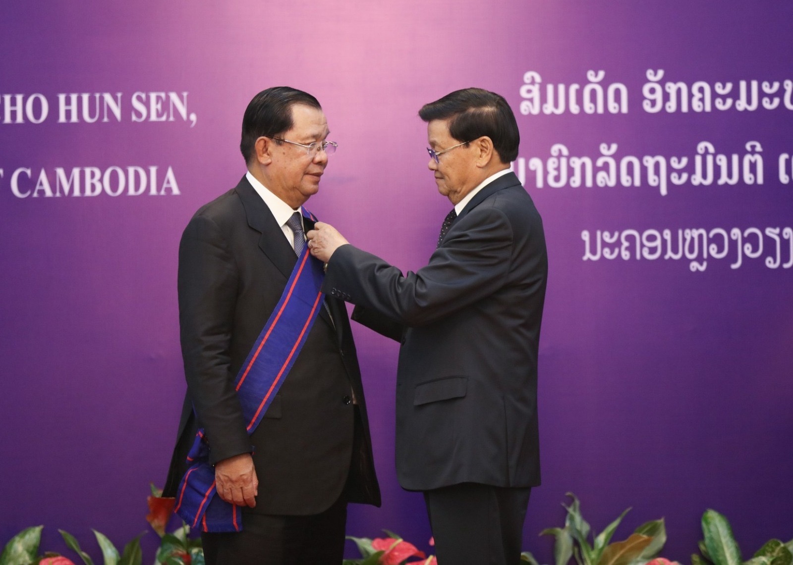 ໃນໂອກາດດຽວກັນນີ້, ທ່ານປະທານປະເທດ ທອງລຸນ ສີສຸລິດ ໄດ້ຕາງໜ້າໃຫ້ພັກ ແລະລັດຖະບານ ແຫ່ງ ສປປ ລາວ ປະດັບຫລຽນໂພໄຊລ້ານຊ້າງໃຫ້ແກ່ສົມເດັດ ອັກຄະມະຫາ ເສນາບໍດີ ເຕໂຈ ຮຸນ ແຊນ, ນາຍົກລັດຖະມົນຕີ ແຫ່ງ ຣາຊະອານາຈັກ ກໍາປູເຈຍ, ເຊິ່ງເປັນຫລຽນທີ່ມອບໃຫ້ຜູ້ນໍາຂອງຕ່າງປະເທດທີ່ມີຄຸນງາມຄວາມດີ, ມີຜົນງານດີເດັ່ນປະກອບສ່ວນໃນການເສີມສ້າງ, ປົກປັກຮັກສາສາຍພົວພັນມິດຕະພາບ ແລະການຮ່ວມມືທີ່ດີງາມຕໍ່ ສປປ ລາວ.