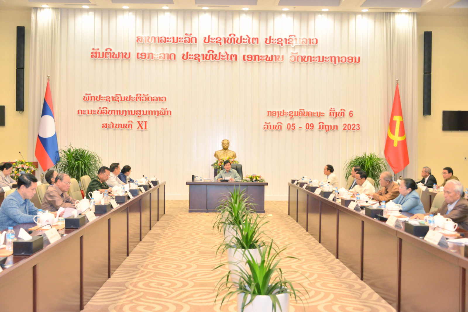 ກອງປະຊຸມຄົບຄະນະຄັ້ງທີ 6 ຂອງຄະນະບໍລິຫານງານສູນກາງພັກ ສະໄໝທີ XI ໄດ້ດຳເນີນຢ່າງເປັນທາງການໃນລະຫວ່າງວັນທີ 5-9 ມິຖຸນາ 2023 ທີ່ສໍານັກງານສູນກາງພັກ, ພາຍໃຕ້ການເປັນປະທານຂອງສະຫາຍ ທອງລຸນ ສີສຸລິດ ເລຂາທິການໃຫຍ່ ຄະນະບໍລິຫານງານສູນກາງພັກປະຊາຊົນປະຕິວັດລາວ, ໂດຍມີບັນດາສະຫາຍກຳມະການກົມການເມືອງສູນກາງພັກ, ຄະນະເລຂາທິການສູນກາງພັກ, ບັນດາສະຫາຍກຳມະການສູນກາງພັກສົມບູນ ແລະສຳຮອງ, ບັນດາສະຫາຍເລຂາຄະນະພັກກະຊວງ, ອົງການ, ເລຂາຄະນະພັກແຂວງຈຳນວນໜຶ່ງເຂົ້າຮ່ວມຢ່າງພ້ອມພຽງ.