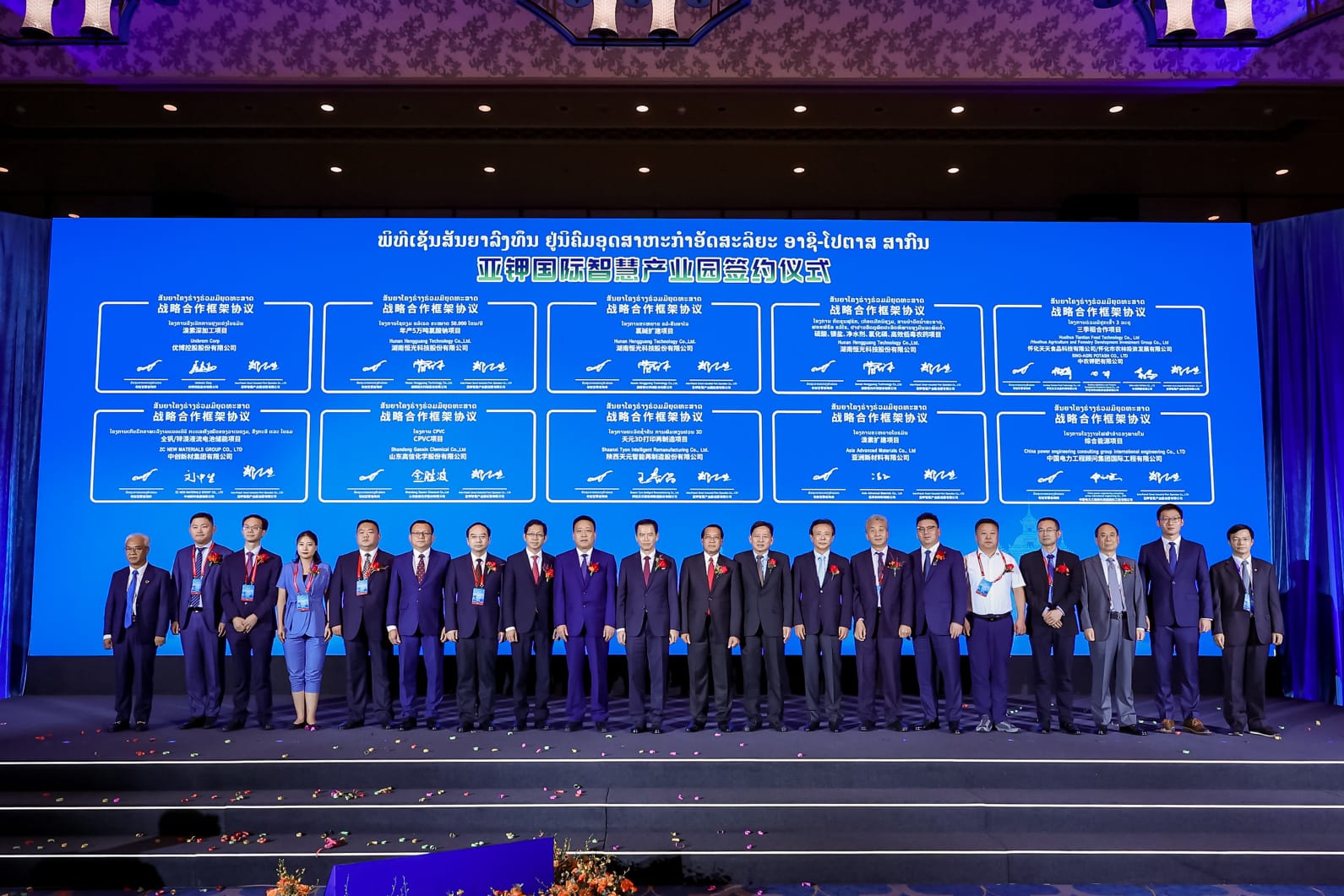 ໃນເວລາ 17:00 ໂມງຂອງວັນດຽວກັນ, ກອງປະຊຸມປະຊາສໍາພັນການລົງທຶນ ແລະພິທີເຊັນບົດບັນທຶກການຮ່ວມມືລົງທຶນຢູ່ນິຄົມອຸດສາຫະກໍາອັດສະລິຍະ ອາຊີ-ໂປຕາສ ສາກົນ ໄດ້ໄຂຂຶ້ນຢ່າງເປັນທາງການ. ເຂົ້າຮ່ວມເປັນສັກຂີພະຍານໃນການເຊັນບົດບັນທຶກການຮ່ວມມືລົງທຶນຄັ້ງນີ້ມີ ທ່ານ ມະໄລທອງ ກົມມະສິດ ລັດຖະມົນຕີ ກະຊວງອຸດສາຫະກໍາ ແລະການຄ້າ, ທ່ານ ວັນໄຊ ພອງສະຫວັນ ເຈົ້າແຂວງຄໍາມ່ວນ, ທ່ານໄຊຊະນະ ສິດທິພອນ ຮອງປະທານ ຄະນະກໍາມະການຮ່ວມມືລາວ-ຈີນ, ທ່ານ ສົມຈິດ ອິນທະມິດ ທີ່ປຶກສາສະພາການຄ້າ ແລະ ອຸດສາຫະກໍາແຫ່ງຊາດລາວ, ທ່ານ Guo Baichun ປະທານ ບໍລິສັດ ອາຊີ-ໂປຕາສ ສາກົນ ຈໍາກັດ, ທ່ານ Chen Jing ຮອງເຈົ້ານະຄອນ ຮ່ວຍຮວາ ສປ ຈີນ, ທ່ານ Wang Xiaokang ປະທານ ສະມາຄົມອຸດສາຫະກໍາປະຢັດພະລັງງານ ແລະ ການຜະລິດສະອາດ ສປ ຈີນ ແລະ ທ່ານ Wang Xiaofeng ປະທານ ສະມາຄົມເກືອອະນົງຄະທາດ ສປ ຈີນ. ບັນດາທ່ານການນໍາຂັ້ນສູນກາງ, ການນໍາແຂວງຄໍາມ່ວນ, ທ່ານ ຂວັນໃຈ ອ່ຽມສຸດທິ, ທີ່ປຶກສາສະຖານທູດ ແຫ່ງ ສປປ ລາວ ປະຈໍາ ສປ ຈີນ, ທ່ານ ນາງ ວັນເພັງ ໄຊສົມພູ ກົງສຸນໃຫຍ່ ແຫ່ງ ສປປ ລາວ ປະຈຳ ກວາງໂຈ ສປ ຈີນ, ຄະນະບໍລິຫານຂອງ ອາຊີ-ໂປຕາສ ສາກົນ, ຕະຫຼອດທັງບັນດາວິສາຫະກິດທີ່ຈະເຂົ້າປະຈໍານິຄົມ, ວິສາຫະກິດທີ່ມີເຈດຈໍານົງລົງທຶນ, ອົງກອນລົງທຶນ, ອົງກອນການເງິນຫຼາຍປະເທດ ແລະ ຜູ້ຊ່ຽວຊານຕ່າງໆ ລວມທັງໝົດ 300 ກວ່າຄົນ ກໍໄດ້ເຂົ້າຮ່ວມງານຍິ່ງໃຫຍ່ຄັ້ງນີ້.