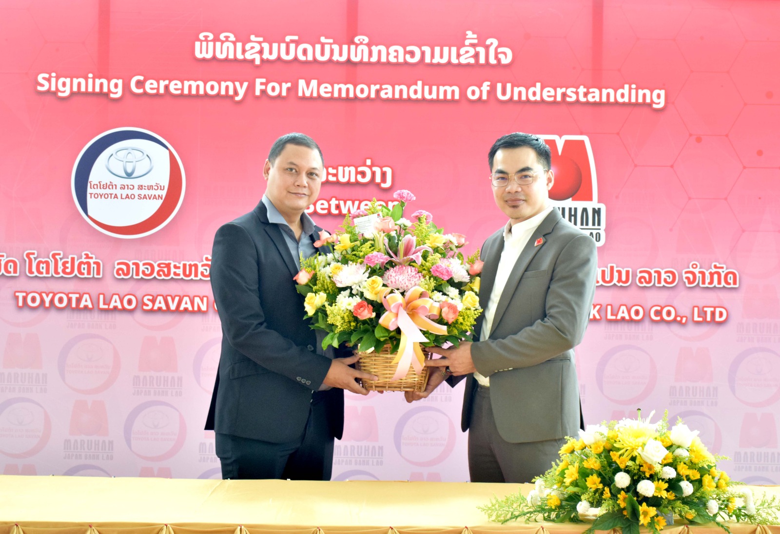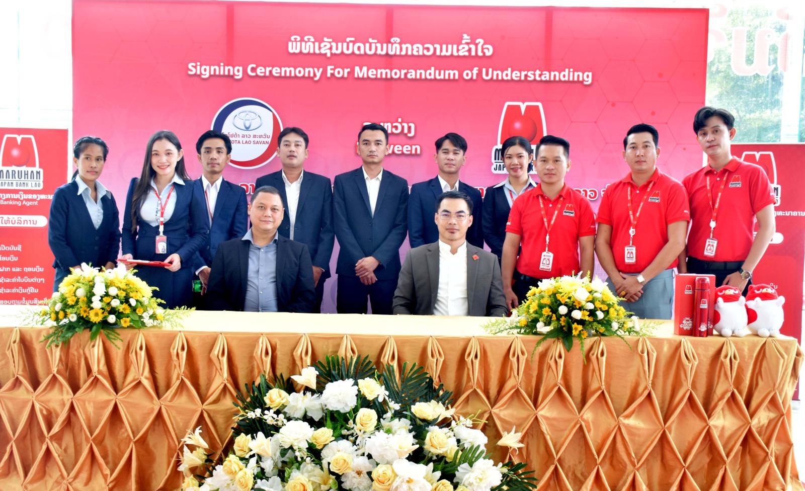 ພິທີລົງນາມການຮ່ວມມືຂອງທັງສອງຝ່າຍ ໄດ້ຈັດຂຶ້ນຢ່າງເປັນທາງການໃນຕອນເຊົ້າວັນທີ 22 ກັນຍາ 2023, ທີ່ ບໍລິສັດ ໂຕໂຍຕ້າລາວ ສະຫວັນ ຈໍາກັດ. ເຊິ່ງຕາງໜ້າເຊັນບົດບັນທຶກຄວາມເຂົ້າໃຈໃນຄັ້ງນີ້ຂອງທ່ານ ພູວະດົນ ວິຣະວົງ ຜູ້ອໍານວຍການ ບໍລິສັດ ໂຕໂຍຕ້າ ລາວ ສະຫວັນ ຈໍາກັດ ແລະທ່ານ ວິຍາສອນ ມູນນະລາດ ຫົວໜ້າພະແນກຕົວແທນທາງການເງິນ ຂອງທະນາຄານມາຣູຮານ ເຈແປນ ລາວ ຈໍາກັດ, ໂດຍມີພະນັກງານຂອງທັງສອງອົງກອນ ພ້ອມດ້ວຍບັນດາແຂກທີ່ເຂົ້າຮ່ວມເປັນສັກຂີພະຍານການຮ່ວມມືໃນຄັ້ງນີ້.