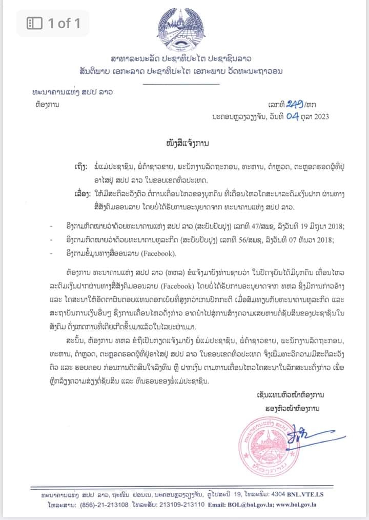 ເລື່ອງ: ໃຫ້ມີສະຕິລະວັງຕົວ ຕໍ່ການເຄື່ອນໄຫວຂອງບຸກຄົນທີ່ເຄື່ອນໄຫວໂຄສະນາລະດົມເງິນຝາກຜ່ານທາງສື່ສັງຄົມອອນລາຍໂດຍບໍ່ໄດ້ຮັບອະນຸຍາດຈາກທະນາຄານແຫ່ງ ສປປ ລາວ.