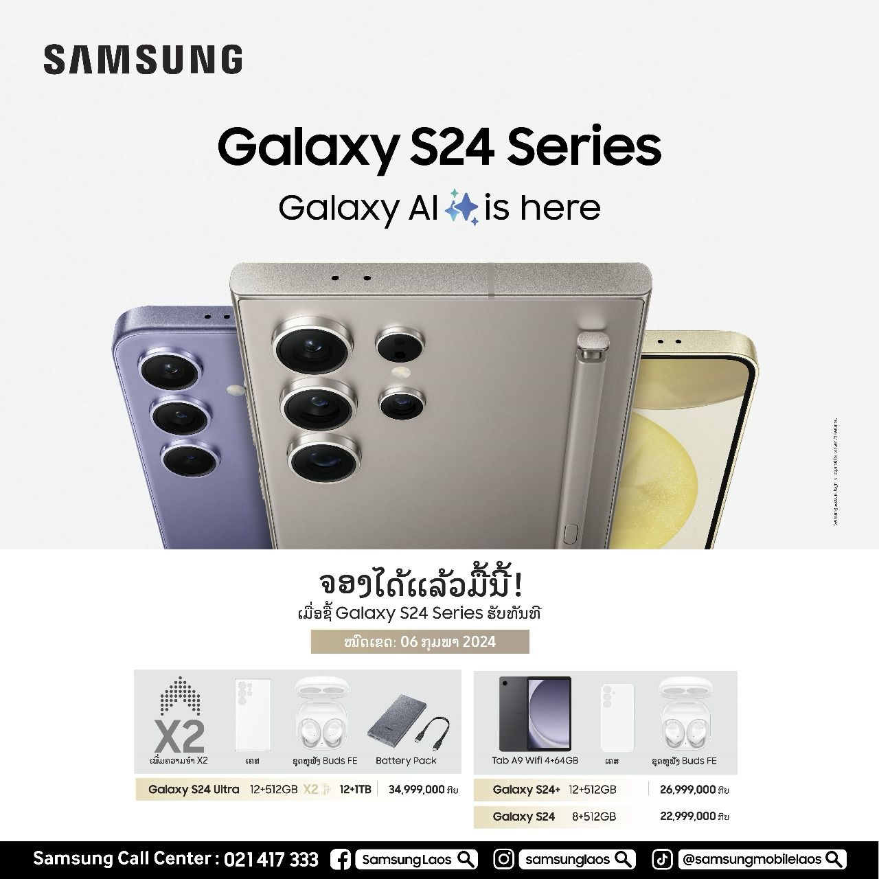 ລາຍລະອຽດເພີ່ມເຕີມ ກາລຸນາຕິດຕໍ່ Samsung Call Center: 021 417 333 ຫຼື ສອບຖາມເພີ່ມເຕີມໄດ້ໃນພື້ນທີ່ຈັດສະແດງ Samsung Galaxy Experience Space ທີ່ສູນການຄ້າ Pakson ນະຄອນຫຼວງວຽງຈັນ ຕັ້ງແຕ່ມື້ນີ້ຈົນຮອດວັນທີ 4 ກຸມພາ 2024.