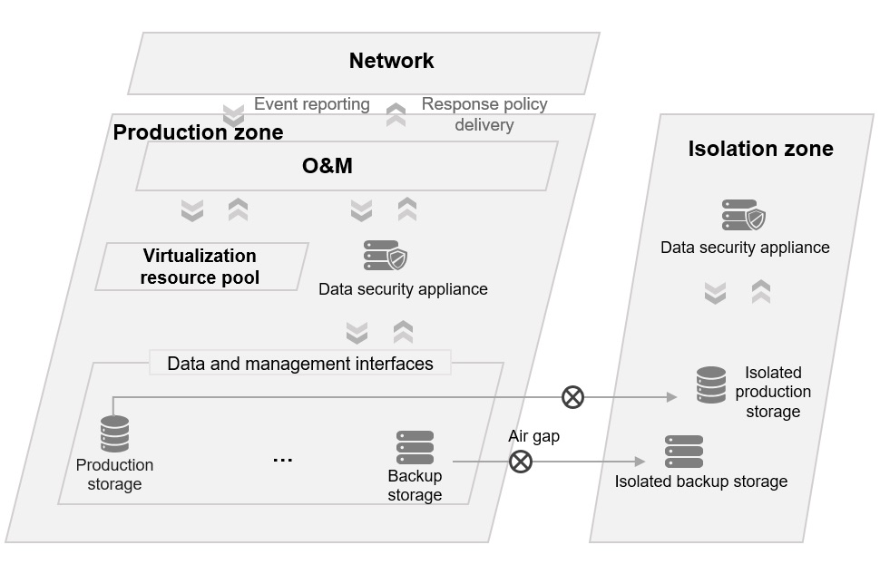 - ປະການສຸດທ້າຍ, ເສີມສ້າງຄວາມແຂງແກ່ງໃຫ້ກັບແນວທາງການປ້ອງກັນສຸດທ້າຍຢູ່ຊັ້ນພື້ນທີ່ຈັດເກັບຂໍ້ມູນສໍາລັບການປ້ອງກັນ ແຣນຊໍ່າແວຣ໌ (Ransomware). ຕົວຢ່າງເຊັ່ນ, ເປີດໃຊ້ການກວດຈັບ ແລະ ການວິເຄາະເພື່ອກໍານົດການໂຈມຕີ ແຣນຊໍ່າແວຣ໌ (Ransomware) ແລະ ສໍາເນົາທີ່ປອດໄພໃນທັນທີ, ໃຊ້ WORM ແລະ Snapshot ທີ່ປອດໄພເພື່ອປ້ອງກັນການບິດເບືອນຂໍ້ມູນ, ໃຊ້ການເຂົ້າລະຫັດເພື່ອປ້ອງກັນການຮົ່ວໄຫລຂອງຂໍ້ມູນ, ແລະໃຊ້ຊ່ອງຫວ່າງທາງອາກາດເພື່ອສ້າງເຂດການແຍກລະບົບສໍາລັບການປົກປ້ອງຂໍ້ມູນອອຟໄລນ໌, ດັ່ງນັ້ນຈຶ່ງເກັບຮັກສາສໍາເນົາສຸດທ້າຍຂອງຂໍ້ມູນທີ່ສະອາດເພື່ອການກູ້ຄືນ.