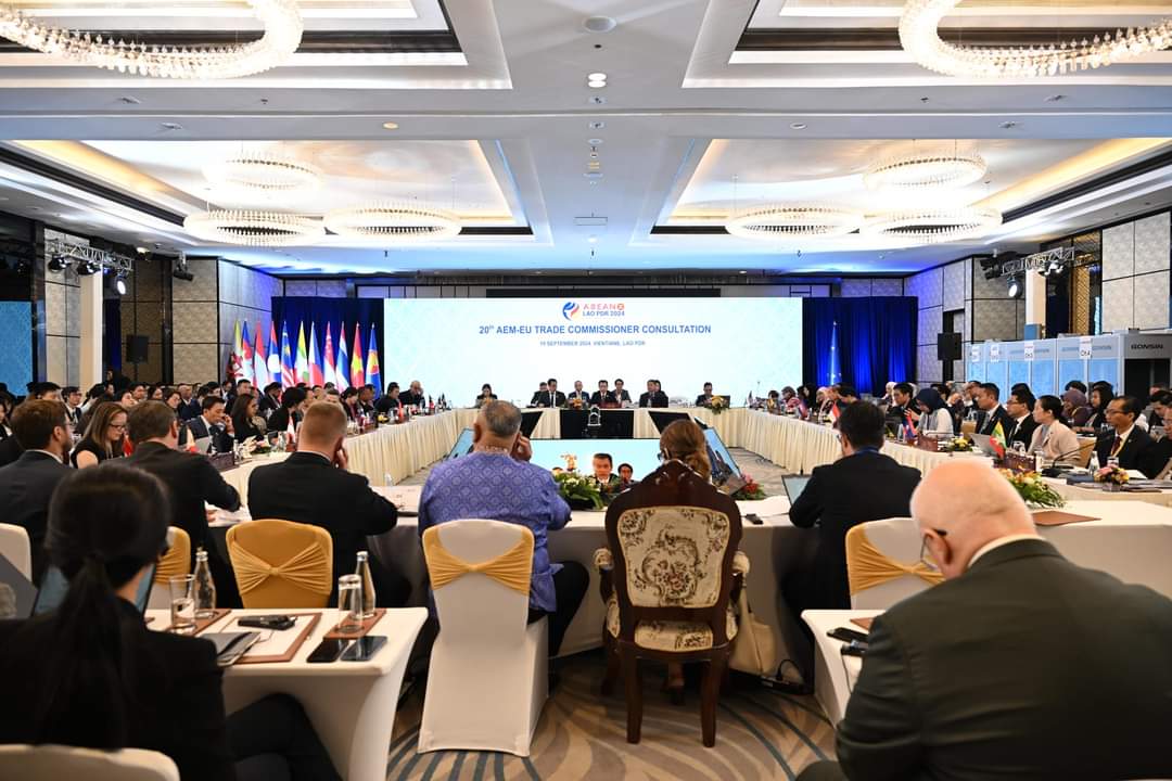 ໃນວັນທີ 19 ກັນຍາ 2024 ທີ່ໂຮງແຮມຄຣາວພາຊາ ນະຄອນຫຼວງວຽງຈັນ ລັດຖະມົນຕີເສດຖະກິດອາຊຽນ ແລະຄະນະກໍາມາທິການການຄ້າ ແຫ່ງສະຫະພາບເອີຣົບ ຈັດກອງປະຊຸມປຶກສາຫາລື ແລກປ່ຽນທັດສະນະ ກ່ຽວກັບການພັດທະນາເສດຖະກິດໃນພາກພື້ນ ແລະສາກົນ, ທົບທວນຄືນຄວາມຄືບໜ້າຂອງການຈັດຕັ້ງປະຕິບັດແຜນການຮ່ວມມືທາງເສດຖະກິດ, ການຄ້າ ແລະການລົງທຶນລະຫວ່າງສອງພາກພື້ນ, ພ້ອມທັງພິຈາລະນາຮັບຮອງເອົາຖະແຫຼງການຮ່ວມຂອງກອງປະຊຸມປຶກສາຫາລື ລະຫວ່າງ ລັດຖະມົນຕີເສດຖະກິດອາຊຽນ ແລະ ຄະນະກໍາມາທິການການຄ້າ ແຫ່ງສະຫະພາບເອີລົບ ຄັ້ງທີ 20, ໂດຍການເປັນປະທານຮ່ວມຂອງທ່ານ ມະໄລທອງ ກົມມະສິດ ລັດຖະມົນຕີກະຊວງອຸດສາຫະກໍາ ແລະການຄ້າ ແຫ່ງ ສປປ ລາວ ແລະ ທ່ານ ນາງ ມາເລຍ ມາຕິນ ພຣັດ (Maria Martin-Prat) ຮອງປະທານຜູ້ບໍລິຫານຂອງຄະນະກໍາມາທິການການຄ້າ ແຫ່ງສະຫະພາບເອີຣົບ, ມີບັນດາລັດຖະມົນຕີເສດຖະກິດອາຊຽນ, ເລຂາທິການໃຫຍ່ອາຊຽນ, ລັດຖະມົນຕີ ກະຊວງການຄ້າ ແລະອຸດສາຫະກໍາຈາກປະເທດຕີມໍແລັດສະເຕ ແລະຫົວໜ້າຄະນະຜູ້ແທນປະເທດສະມາຊິກອາຊຽນ ເຂົ້າຮ່ວມ.