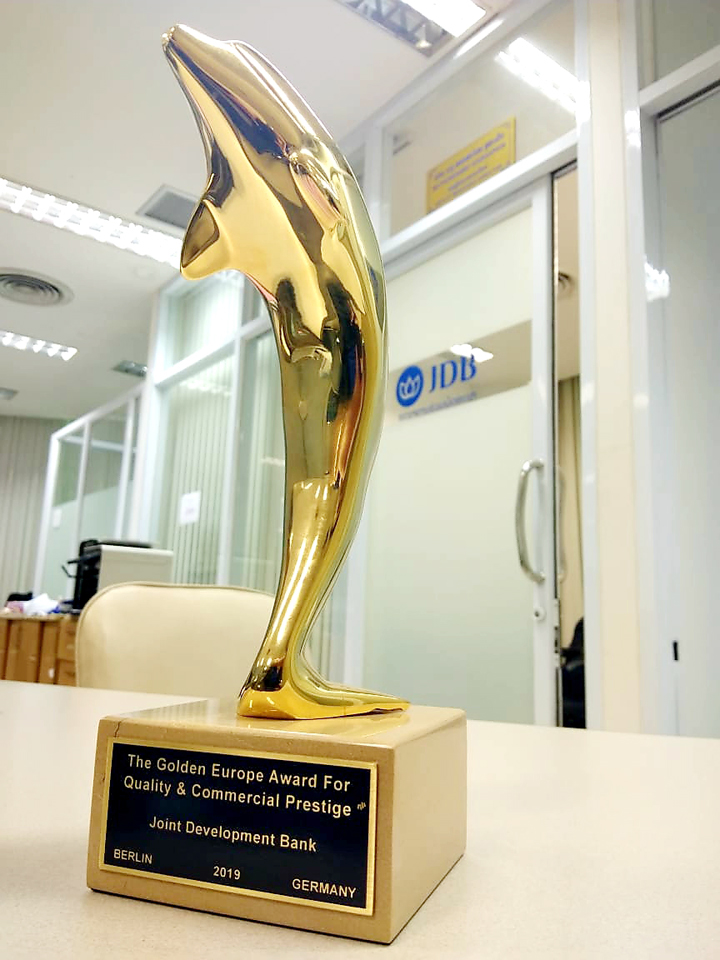 ຂັນລາງວັນໂລ້ຄໍາ THE GOLDEN EUROPE AWARD FOR QUALITY and COMMERCIAL PRESTIGE ເປັນລາງວັນທໍາອິດທີ່ທະນາຄານຮ່ວມພັດທະນາໄດ້ຮັບໃນລະດັບສາກົນເປັນລາງວັນຈາກເອີຣົບທີ່ຢັ້ງຢືນເຖິງການບໍລິການທີ່ມີຄຸນນະພາບ ແລະມີຊື່ສຽງທີ່ດີ. ການມອບລາງວັນໃຫ້ຂະແໜງການທະນາ ຄານໃນປີນີ້ມີແຕ່ທະນາຄານ JDB ທະນາຄານດຽວທີ່ໄດ້ຮັບຂັນລາງວັນດັ່ງກ່າວ. ອົງກອນຜູ້ຈັດການມອບລາງວັນໄດ້ຄັດເລືອກບໍລິສັດຕ່າງໆທົ່ວໂລກ ມີ 30 ບໍລິສັດທີ່ໄດ້ຮັບກຽດຮັບລາງວັນໃນຄັ້ງນີ້, ສໍາລັບປະເທດລາວເຮົາມີແຕ່ທະນາຄານຮ່ວມພັດທະນາທີ່ໄດ້ຖືກຄັດເລືອກຊຶ່ງເປັນລາງວັນທີ່ຊົງກຽດຢູ່ໃນລະດັບສາກົນເພາະຕາມຊື່ຂອງລາງວັນແມ່ນ: ລາງວັນໂລ້ຄໍາເອີຣົບ ທີ່ໃຫ້ສໍາລັບບັນດາບໍລິສັດ ຫຼື ວ່າທະນາຄານທີ່ມີການບໍລິການທີ່ມີຄຸນນະພາບ, ມີການເຕີບໃຫຍ່, ມີຊື່ສຽງທາງດ້ານການຄ້າ.