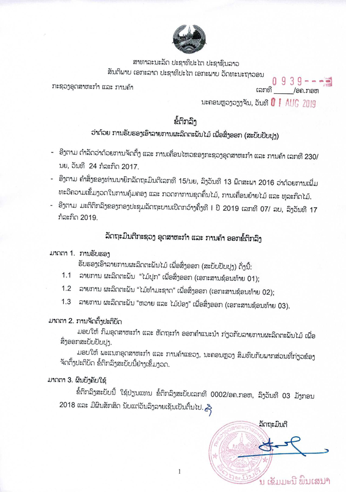 ສະນັ້ນເພື່ອປະຕິບັດຕາມມະຕິຕົກລົງຂອງກອງຊຸມດັ່ງກ່າວໃນວັນທີ 1 ສິງ ຫາ 2019 ທາງກະຊວງອຸດສາຫະກຳ ແລະການຄ້າຈຶ່ງໄດ້ອອກຂໍ້ຕົກລົງສະບັບເລກທີ 0939/ອຄ,ກອຫ ວ່າດ້ວຍການຮັບຮອງເອົາລາຍການຜະລິດຕະພັນໄມ້ເພື່ອສົ່ງອອກ (ສະບັບປັບປຸງ) ໂດຍຮັບຮອງເອົາລາຍການຜະລິດຕະພັນໄມ້ປູກເພື່ອສົ່ງອອກ; ລາຍການຜະລິດຕະພັນໄມ້ທຳມະຊາດເພື່ອສົ່ງອອກ ແລະລາຍການຜະລິດຕະພັນຫວາຍລວມເຖິງໄມ້ປ່ອງເພື່ອສົ່ງອອກໂດຍມອບໃຫ້ກົມອຸດສາຫະກຳແລະຫັດຖະກຳອອກຄຳແນະນຳກ່ຽວກັບລາຍການຜະລິດຕະພັນໄມ້ເພື່ອສົ່ງອອກສະບັບປັບປຸງ, ໃຫ້ພະແນກອຸດສາຫະກຳແລະການຄ້າແຂວງ, ນະຄອນຫຼວງສົມທົບກັບພາກສ່ວນທີ່ກ່ຽວຂ້ອງຈັດຕັ້ງປະຕິບັດຕາມຂໍ້ຕົກລົງຢ່າງເຂັ້ມງວດ.