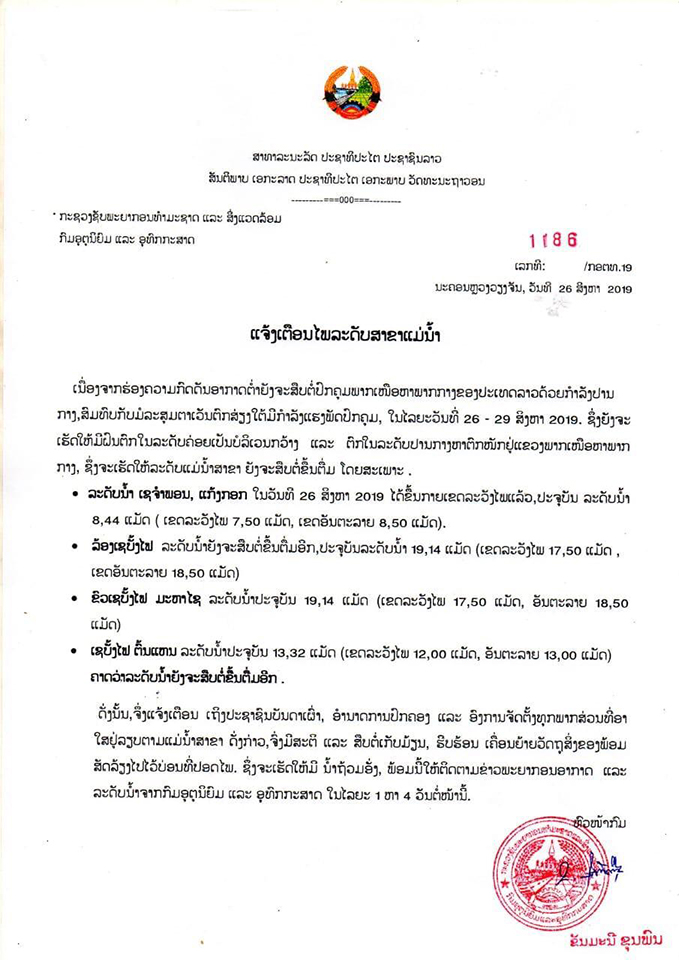 ກົມອຸຕຸນິຍົມ ແລະອຸທົກກະສາດອອກແຈ້ງເຕືອນໄພ ລະດັບນໍ້າສາຂາແມ່ນໍ້າທີ່ກຳລັງສູງຂຶ້ນ, ລະຫວ່າງວັນທີ 26-29 ສິງຫາ 2019