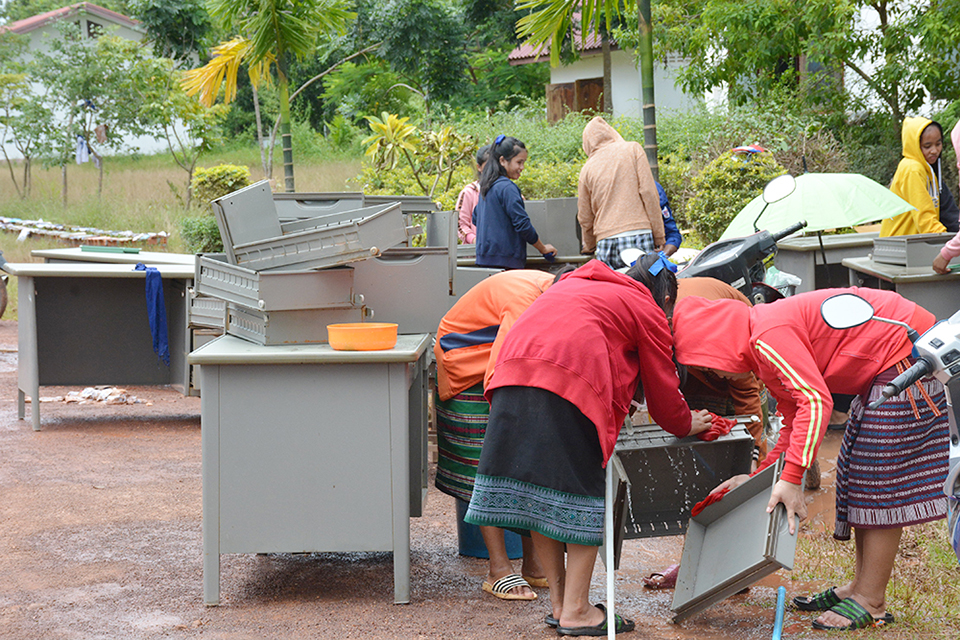 ,ສະໂມສອນ ແລະໂຮງງານນໍ້າດື່ມໄດ້ຮັບຜົນເສຍຫາຍ ແລະປະເພດເອກະສານຕ່າງໆ,ປຶ້ມຕຳລາຮຽນ, ເຄື່ອງປັບອາກາດ,ຄອມພິວເຕີ 4 ເຄື່ອງ,ໂຕະຕັ່ງກໍ່ຖືກນໍ້າຊຸໄຫຼ,ກອບກູ້ໄດ້ຈຳນວນໜຶ່ງສູນເສຍພຽງແຕ່ 10%, ຊຶ່ງປະເມີນມູນຄ່າເສຍຫາຍທັງໝົດ 30 ລ້ານກວ່າກີບ,ພາຍຫຼັງ ທີ່ນໍ້າໄດ້ບົກແຫ້ງລົງກໍ່ໄດ້ນໍາກໍາລັງຄູ-ອາຈານ,ນັກຮຽນຊ່ວຍກັນແກ້ໄຂໃນເບື້ອງຕົ້ນເຊັ່ນ:ເກັບມ້ຽນວັດຖຸສິ່ງຂອງຕ່າໆ ແລະ ແກ້ໄຂຈັດຫານໍ້າດື່ມ,ອາຫານ,ເຂົ້າໃຫ້ນັກຮຽນພາຍໃນໂຮງຮຽນໄດ້ຈຳນວນໜຶ່ງ.