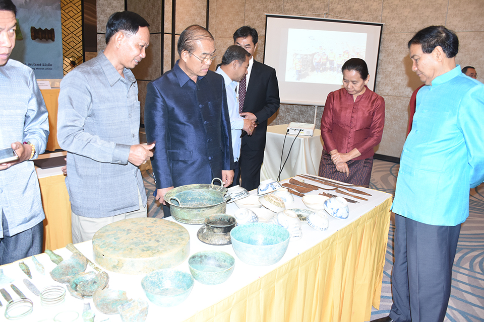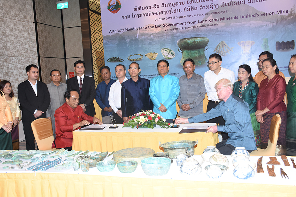 ວັນທີ 24 ກັນຍາຜ່ານມາ ທີ່ນະຄອນຫຼວງວຽງຈັນ ໄດ້ມີພີທິມອບ-ຮັບວັດຖຸບູຮານທີ່ຄົ້ນພົບຢູ່ໂຄງການບໍ່ຄຳ-ທອງເຊໂປນໃຫ້ແກ່ລັດຖະບານລາວຢ່າງເປັນທາງການໂດຍລົງນາມມອບ-ຮັບລະຫວ່າງ ທ່ານ ສະໝານ ອະເນກາ ຜູ້ອຳນວຍການໃຫຍ່ບໍລິສັດລ້າງຊ້າງມິເນໂຣນສ໌ລິມິເຕັດ (ລຊມລ), ທ່ານ ນາງ ວັນເພັງ ແກ້ວປັນຍາ