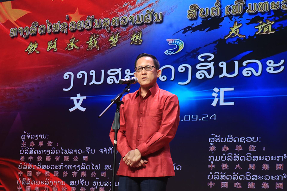 ກຸ່ມບໍລິສັດວິສະວະກຳທາງລົດໄຟເລກ 8 ສປ ຈີນ ຈຳກັດໄດ້ຈັດງານສະແດງສິລະປະລາວ-ຈີນ ພາຍໃຕ້ຫົວຂໍ້ “ທາງລົດໄຟລາວ-ຈີນ ຊ່ວຍບັນລຸຄວາມຝັນສືບຕໍ່ເພີ່ມທະວີມິດຕະພາບ ລາວ-ຈີນ” ເນື່ອງໃນໂອກາດວຽກງານກໍ່ສ້າງພື້ນຖານທາງຂອງທາງລົດໄຟລາວ-ຈີນຢູ່ ໃນໄລຍະບາດລ້ຽວບາດຕໍ່ໃນການບັນລຸວຽກງານເພື່ອບົ່ງບອກເຖິງໝາກຜົນສຳເລັດຂອງການກໍ່ສ້າງ.