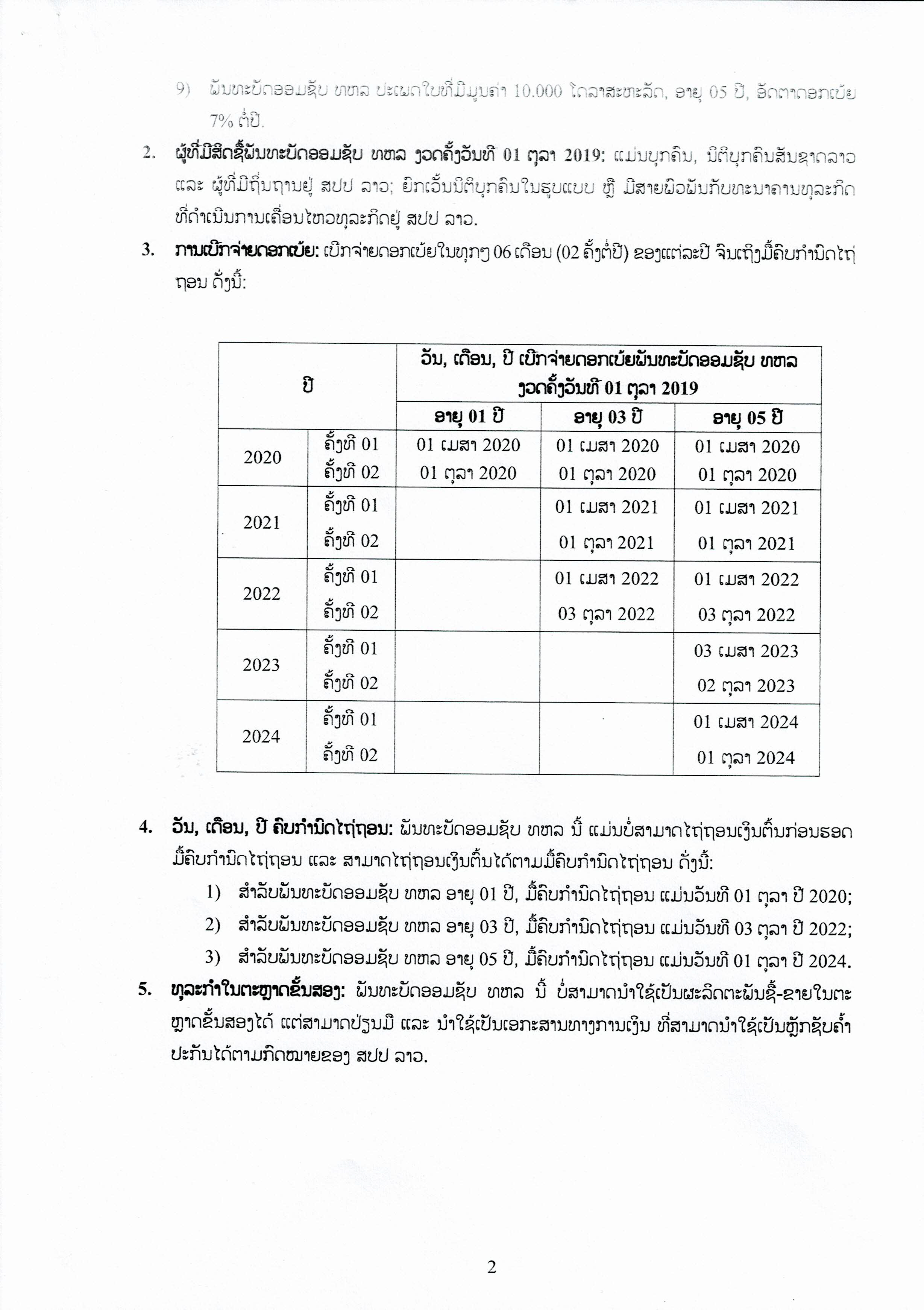 ສໍາລັບຜູ້ທີ່ມີສິດຊື້ພັນທະບັດອອມຊັບ ທຫລ ແມ່ນບຸກຄົນ, ນິຕິບຸກຄົນສັນຊາດລາວ ແລະ ຜູ້ທີ່ມີຖິ່ນຖານຢູ່ ສປປ ລາວ; ຍົກເວັ້ນນິຕິບຸກຄົນໃນຮູບແບບ ຫຼື ມີສາຍພົວ ພັນກັບທະນາຄານທຸລະກິດທີ່ດໍາເນີນການເຄື່ອນໄຫວທຸລະກິດຢູ່ ສປປ ລາວ ໃນການເບີກຈ່າຍດອກເບ້ຍແມ່ນທຸກໆ 6 ເດືອນ (2 ຄັ້ງຕໍ່ປີ) ຂອງແຕ່ລະປີຈົນເຖິງມື້ຄົບກໍານົດໄຖ່ຖອນພັນທະບັດອອມຊັບ ທຫລ ນີ້ແມ່ນບໍ່ສາມາດໄຖ່ຖອນເງິນຕົ້ນກ່ອນຮອດມື້ຄົບກໍານົດແຕ່ສາມາດໄຖ່ຖອນເງິນຕົ້ນໄດ້ເມື່ອຮອດມື້ຄົບກໍານົດໄຖ່ຖອນ.
