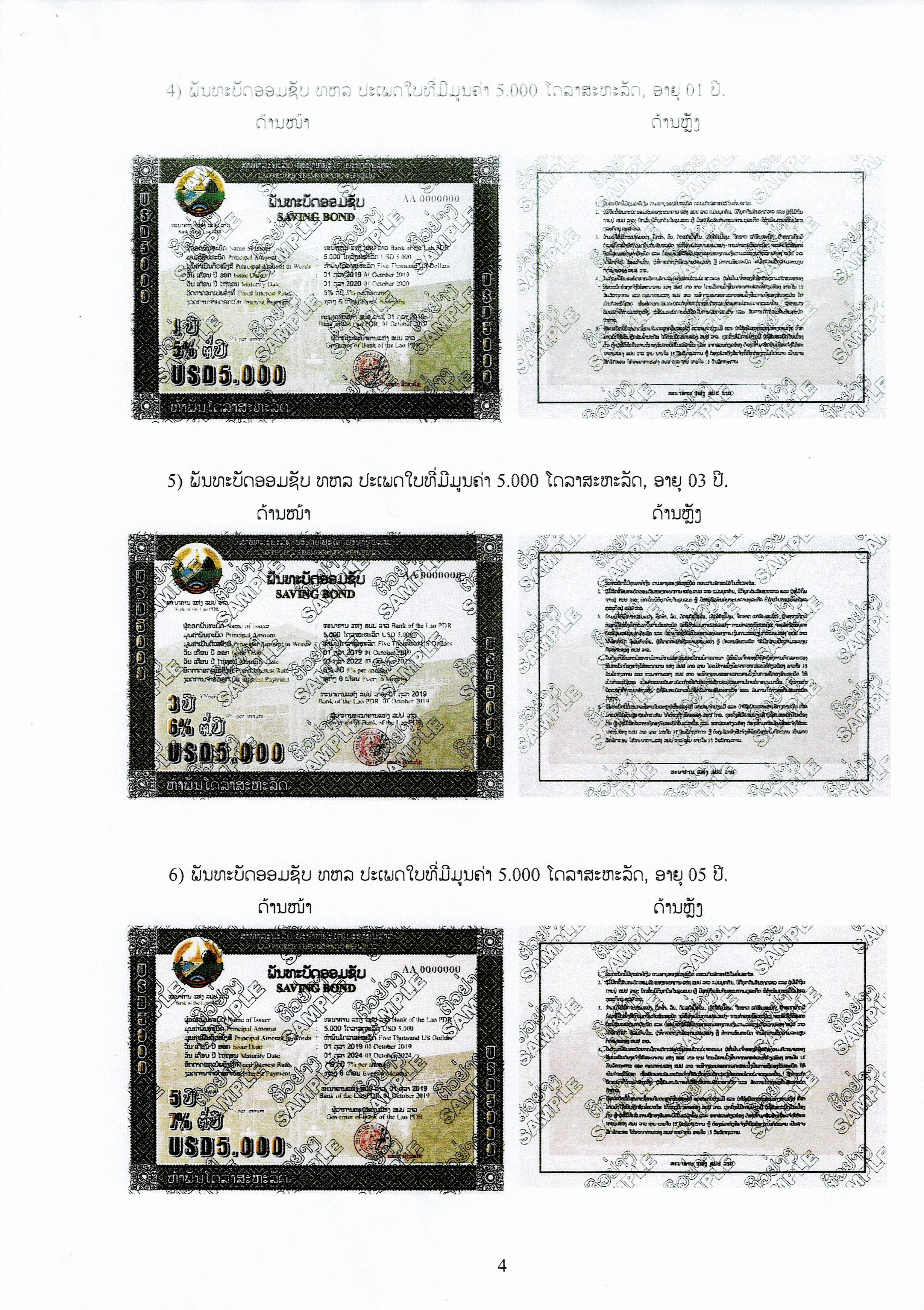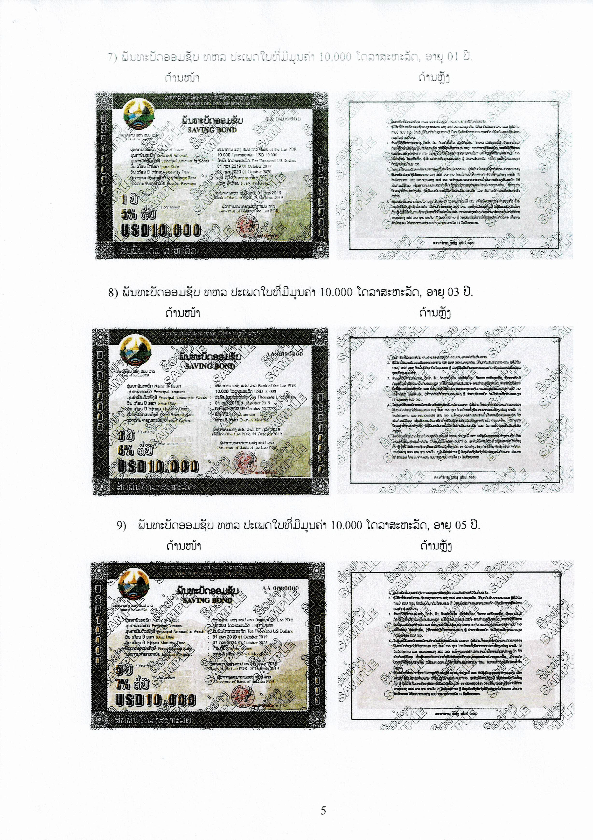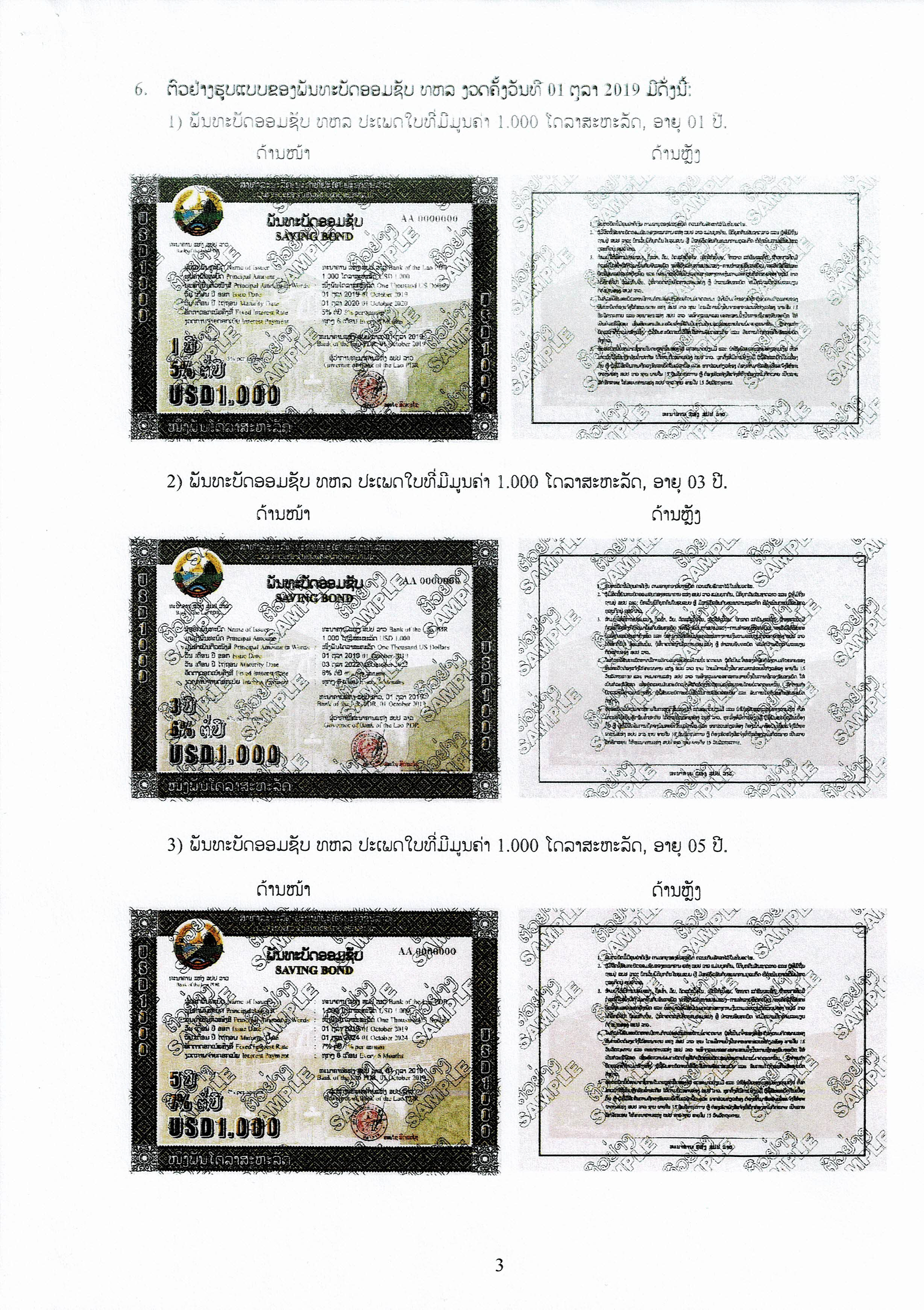 ສໍາລັບຮູບແບບ ຫຼື ຕົວຢ່າງຂອງພັນທະບັດອອມຊັບ ທຫລ ຈະມີຮູບແບບດ້ານໜ້າ ແລະດ້ານຫຼັງຄືກັນ, ຈະແຕກຕ່າງແຕ່ລະມູນຄ່າປະເພດໃບພັນທະບັດ, ອາຍຸ ແລະອັດຕາດອກເບ້ຍ.