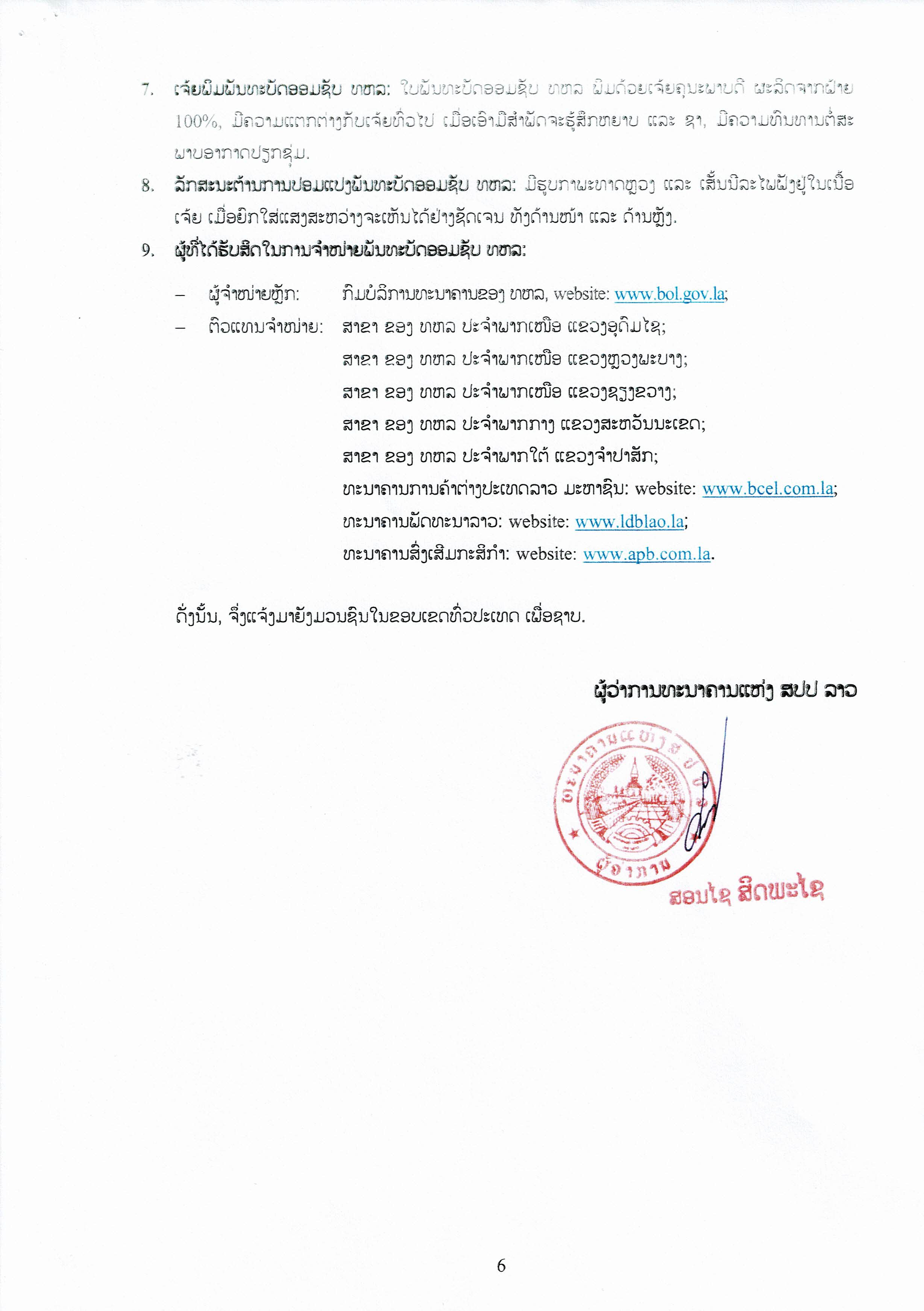 ສະເພາະຜູ້ທີ່ໄດ້ຮັບສິດໃນການຈໍາໜ່າຍພັນທະບັດອອມຊັບ ທຫລ: ຜູ້ຈໍາໜ່າຍຫຼັກແມ່ນກົມບໍລິການທະນາຄານຂອງ ທຫລ, website: www.bol.gov.la ແລະມີຕົວແທນຈໍາໜ່າຍຢູ່ສາຂາຂອງ ທຫລ ປະຈໍາພາກເໜືອ ແຂວງອຸດົມໄຊ; ແຂວງຫຼວງພະບາງ; ແຂວງຊຽງຂວາງ; ສ່ວນສາຂາຂອງ ທຫລ ປະຈໍາພາກກາງຢູ່ແຂວງສະຫວັນນະເຂດ ແລະ ສາຂາຂອງ ທຫລ ປະຈໍາພາກໃຕ້ ແຂວງຈໍາປາສັກ; ສໍາລັບທະນາຄານທຸລະກິດແມ່ນມີຈໍາໜ່າຍຢູ່ທະນາຄານການຄ້າຕ່າງປະເທດລາວ ມະຫາຊົນ, ທະນາຄານພັດທະນາລາວ ແລະທະນາຄານສົ່ງເສີມກະສິກໍາ.