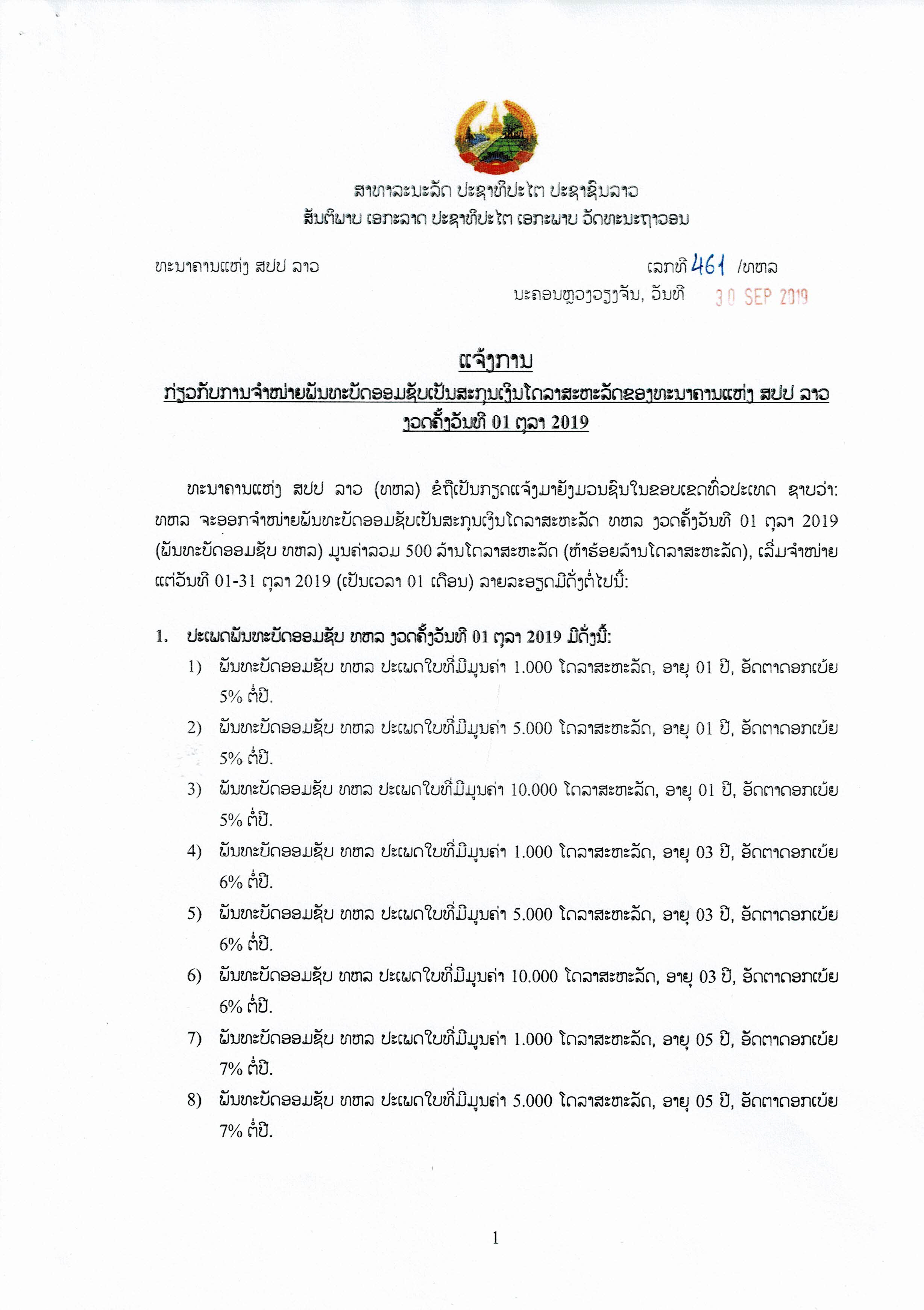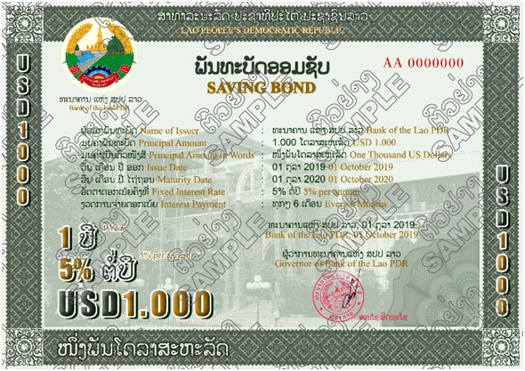 ເລີ່ມແຕ່ວັນທີ 1 ຕຸລາ 2019 ເປັນຕົ້ນໄປທະນາຄານແຫ່ງ ສປປ ລາວ (ທຫລ) ໄດ້ອອກຈໍາໜ່າຍພັນທະບັດອອມຊັບ ທຫລ ເປັນສະກຸນເງິນໂດລາສະຫະລັດງວດທີ I ໃນມູນຄ່າລວມ 500 ລ້ານ ໂດລາສະຫະລັດຊຶ່ງຈະຈໍາໜ່າຍເປັນເວລາ 1 ເດືອນນັບແຕ່ວັນທີ 1-31 ຕຸລາ2019.