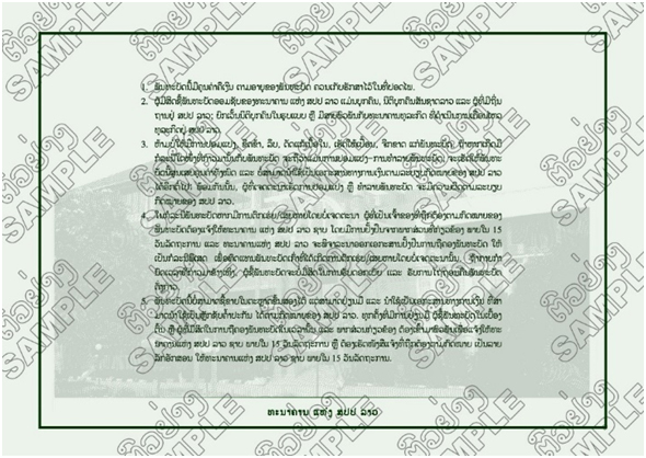 ສໍາລັບຄຸນລັກສະນະໃບພັນທະບັດອອມຊັບ ທຫລ ແມ່ນພິມດ້ວຍເຈ້ຍຄຸນນະພາບດີຜະລິດຈາກຝ້າຍ 100% ຈະແຕກຕ່າງກັບເຈ້ຍທົ່ວໄປເມື່ອເອົາມືສໍາພັດຈະຮູ້ສຶກຫຍາບ ແລະຊາ, ມີຄວາມທົນທານຕໍ່ສະພາບອາກາດປຽກຊຸ່ມ, ພ້ອມນີ້ຈະມີລັກສະນະຕ້ານການປອມແປງໂດຍມີຮູບກາພະທາດຫຼວງ ແລະ ເສັ້ນນີລະໄພຝັງຢູ່ໃນເນື້ອເຈ້ຍເມື່ອຍົກໃສ່ແສງສະຫວ່າງຈະເຫັນໄດ້ຢ່າງຊັດເຈນທັງດ້ານໜ້າ ແລະດ້ານຫຼັງ.