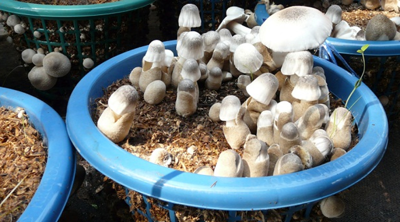 ຫຼັງຈາກເຮັດໝົດຕາມຂັ້ນຕອນ ແລ້ວກໍ່ໃຫ້ເອົານໍ້າສະອາດມາຫົດຈົນຊຸ່ມ (ຫ້າມໃຊ້ນໍ້າປະປາເພາະ ມີຄໍລີນ, ນໍ້າທີ່ມີລົດເຄັມ, ສົ້ມຈະເຮັດ ໃຫ້ເຊື້ອເຫັດບໍ່ອອກດອກຫຼາຍ)ຈຶ່ງນໍາມາໄວ້ທີ່ເຮືອນເພາະຖ້າໃຊສຸ່ມ ໄມ້ໃຜ່ແມ່ນວາງບໍ່ໃຫ້ກະຕ່າໃກ້ ເກີນໄປຕ້ອງຫ່າງປະມານ1ຄືບ.ຖ້າຢູ່ໃນໂຮງເຮືອນຕ້ອງຄວບຄຸມ ອຸນຫະພູມໃຫ້ຢູ່ໃນລະຫວ່າງ 37-40 ອົງສາ (1-8 ມື້) ແລຕ້ອງກວດອຸນຫະພູມໃຫ້ໄດ້ລະດັບຢູ່ ສະເໝີຫາກອຸນຫະພູມສູງຕ້ອງເປີດລະບາຍອາກາດກົງກັນຂ້າມຖ້າອຸນຫະພູມຕໍ່າຕ້ອງປິດຜ້າໃຫ້ສະໜິດໃຫ້ສັງເກດເບິ່ງນໍ້າຢູ່ພລາສຕິກຄຸມຖ້າເຫັນວ່າມີນໍ້າຄ້າງຖືວ່າໃຊ້ໄດ້ຖ້າບໍ່ມີໃຫ້ຫົດນໍ້າອ້ອມໂຮງເຮືອນໃຫ້ຊຸ່ມ,ຈາກນັ້ນປະມານມື້ທີ 8 ຂອງການເພາະຈະເຫັນເຊື້ອເຫັດສີຂາວເກີດຂຶ້ນແຕ່ບໍ່ຕ້ອງເປີດຜ້າ ເພາະຈະເຮັດໃຫ້ເຊື້ອເຫັດຟໍ ແລະຢຸດການຈະເລີນເຕີບໂຕຕ້ອງປະໄວ້ປະມານ 10-11 ມື້ ຈາກນັ້ນ ຈຶ່ງຄ່ອຍເກັບຜົນຜະລິດໄດ້.