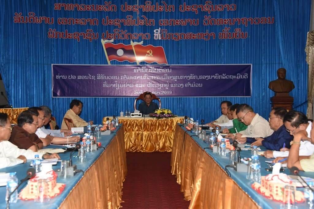 ວັນທີ 2 ຕຸລາ 2019 ທ່ານ ສອນໄຊ ສີພັນດອນ ຮອງນາຍົກລັດຖະມົນຕີ ພ້ອມດ້ວຍຄະນະໄດ້ລົງເຄື່ອນໄຫວຢ້ຽມຢາມ ແລະເຮັດວຽກຢູ່ ແຂວງຄຳມ່ວນ ໂດຍໄດ້ຮັບການຕ້ອນຮັບ ແລະຟັງການລາຍງານກ່ຽວກັບແຜນການພັດທະນາເສດຖະກິດ-ສັງຄົມ ຂອງແຂວງໂດຍສະເພາະໄດ້ຮັບຟັງການລາຍງານກ່ຽວກັບຜົນເສຍຫາຍຈາກໄພນໍ້າຖ້ວມ ແລະການແກ້ໄຂຜົນກະທົບຫລັງນໍ້າຖ້ວມຈາກ ທ່ານ ສົມໃຈ ເພັດສີນວນ ຮອງເຈົ້າແຂວງຄຳມ່ວນໂດຍມີຄະນະນຳຂອງແຂວງ ແລະຂະແໜງການທີ່ກ່ຽວຂ້ອງ ເຂົ້າຮ່ວມ.