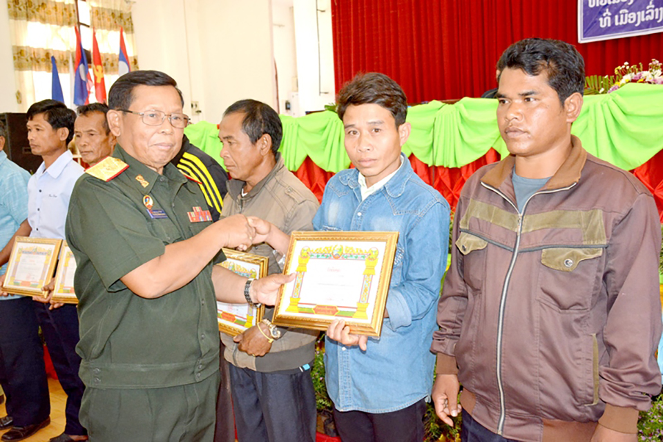 ທິດທາງຕໍ່ໜ້າເອົາໃຈໃສ່ກຳແໜ້ນທີ່ຕັ້ງຈຸດພິເສດ ແລະເງື່ອນໄຂຂອງແຕ່ລະຄອບຄົວ, ຂອງແຕ່ລະບ້ານ ແລະແຕ່ລະກຸ່ມໃນທົ່ວເມືອງເພື່ອໃຫ້ສະດວກສະບາຍໃນການຈັດຕັ້ງປະຕິບັດໜ້າທີ່ວຽກ ງານ, ເປັນເຈົ້າການເອົາໃຈໃສ່ຂຸນ ຄົ້ນທຸກທ່າແຮງບົ່ມຊ້ອນເພື່ອເຮັດ ໃຫ້ຄັງແຮມີການຂະຫຍາຍຍຕົວ ແລະເພີ່ມຂຶ້ນໃນແຕ່ລະປີໂດຍຕິດພັນກັບການເຮັດວຽກງານການ ເມືອງ-ນຳພາແນວຄິດ, ພ້ອມທັງ ແບ່ງຄວາມຮັບຜິດຊອບໂດຍປະ ສານສົມທົບກັນ ແລະກຳນົດວຽກ ງານດັ່ງກ່າວ, ການຈັດຕັ້ງປະຕິບັດໃນການເກັບເງິນເຂົ້າຄັງແຮແຕ່ລະປີຕ້ອງປະຕິບັດໄປພ້ອມໆກັນທັງ 4 ດ້ານຄື: ດ້ານການເມືອງແນວຄິດ, ດ້ານການຈັດຕັ້ງ ແລະດ້ານຕົວເລກ ຄາດໝາຍຕ້ອງລະອຽດຊັດເຈນ, ຖືກຕ້ອງ ແລະໂປ່ງໃສ, ຈາກນັ້ນ ທ່ານ ນາງ ສູນທອນ ແກ້ວບົວລະ ພາ ເລຂາພັກເມືອງ ເຈົ້າເມືອງເລົ່າ ງາມ ປະທານປ້ອງກັນຊາດ-ປ້ອງກັນຄວາມຫງົບຂັ້ນເມືອງ ກໍ່ໄດ້ໃຫ້ ກຽດຂຶ້ນມອບໃບຍ້ອງຍໍຈຳນວນ 8 ກຸ່ມບ້ານ ແລະ 39 ບ້ານ ແລະທ່ານ ພົນຈັດຕະວາພູວຽງ ຫຼ່ຽມມະວົງສາ ຫົວໜ້າກອງບັນຊາການທະຫານແຂວງ ທັງແມ່ນຮອງປະ ທານປ້ອງກັນຊາດ-ປ້ອງກັນຄວາມສະຫງົບຂັ້ນແຂວງກໍ່ໄດ້ມອບໃບຍ້ອງຍໍໃຫ້ຈຳນວນ 19 ກົມກອງ ທີ່ມີຜົນງານດີເດັ່ນໃນການຈັດຕັ້ງປະຕິບັດໜ້າທ່ີວຽກງານໃນໄລຍະຜ່ານມາ.