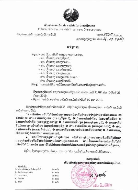 ອີງຕາມໜັງສືສະເໜີຂອງກະຊວງການຕ່າງປະເທດສະບັບເລກທີ 7170/ຕປທ ລົງວັນທີ 23 ກັນຍາ 2019 ແລະອີງຕາມການຊີ້ນຳພາຂອງທ່ານນາຍົກລັດຖະມົນ ຕີ ຄັ້ງວັນທີ 9 ຕຸລາ 2019 ຫ້ອງວ່າການສໍານັກງານນາຍົກລັດຖະມົນຕີໄດ້ອອກແຈ້ງການສະບັບເລກທີ 1845/ຫສນຍ ລົງວັນທີ 16 ຕຸລາ 2019 ໂດຍລັດຖະ ບານໄດ້ເຫັນດີອະນຸມັດໃຫ້ປິດໜ່ວຍງານອອກວີຊ່າປະຈຳຢູ່ດ່ານສາກົນຈຳນວນ 9 ດ່ານຄື: 1 ດ່ານສາກົນປາງຫົກ (ແຂງຜົ້ງສາລີ), 2 ດ່ານສາກົນນໍ້າໂສຍ (ແຂວງ ຫົວພັນ), 3 ດ່ານສາກົນນໍ້າກັ່ນ (ແຂວງຊຽງຂວາງ), 4 ດ່ານສາກົນນໍ້າເງິນ (ແຂວງໄຊຍະບູລີ), 5 ດ່ານສາກົນຂົວມິດຕະພາບນໍ້າເຫືອງ (ແຂວງໄຊຍະບູລີ), 6 ດ່ານສາກົນນໍ້າພາວ (ແຂວງຄຳມ່ວນ), 7 ດ່ານສາກົນນາເພົ້າ (ແຂວງຄຳມ່ວນ), 8 ດ່ານສາກົນສະໜາມບິນສະຫວັນນະເຂດ ແລະ 9 ດ່ານສາກົນພູເກືອ (ແຂວງອັດຕະປື).