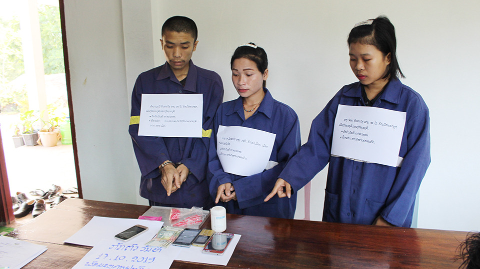 ເຈົ້າໜ້າທີ່ຈຶ່ງໄດ້ເຂົ້າກັກຕົວທ້າວ ບຸນມີ ອາຍຸ 26 ປີ ປະຊາຊົນບ້ານໃຫຍ່ນາຫຼາເມືອງໄຊຍະບູລີ ແລະນາງ ຢາ ອາຍຸ 24 ປີປະຊາຊົນຢູ່ບ້ານນາເມືອງ ເມືອງໄຊຍະບູລີ ທັງສອງເປັນຜົວເມຍກັນ ແລະນາງ ຈ່ອຍ ກັນທະວົງ ອາຍຸ 16 ປີອາຊີບປະຊາຊົນຢູ່ບ້ານໃຫຍ່ນາຫຼາຜູ້ເປັນອາພ້ອມທັງໄດ້ເຂົ້າກວດເຮືອນຂອງຜູ້ກ່ຽວສາມາດຍຶດໄດ້ວັດ ຖຸຂອງກາງຢາບ້າຈໍານວນ 393 ເມັດ, ເງີນ 5 ແສນກີບ, ລົດຈັກ 1 ຄັນ, ໂທລະສັບ 4 ເຄື່ອງມາສືບສວນ-ສອບສວນເພື່ອຂະຫຍາຍຜົນຫາກຸ່ມແກ້ງມາລົງໂທດຕາມກົດໝາຍ.