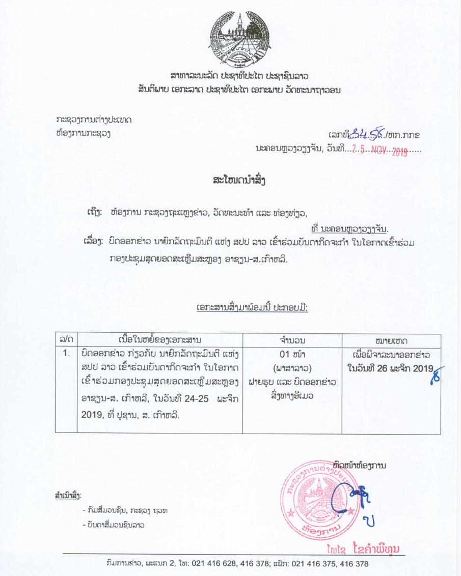 ໃນຕອນເຊົ້າຂອງວັນທີ 25 ພະຈິກ 2019, ພະນະທ່ານ ທອງລຸນ ສີສຸລິດ, ນາຍົກລັດຖະມົນຕີ, ໄດ້ນຳພາຄະນະຜູ້ແທນລາວເຂົ້າຮ່ວມພິທີເປີດກອງປະຊຸມສຸດຍອດຜູ້ບໍລິຫານພາກທຸລະກິດ ອາຊຽນ-ສ.ເກົາຫລີ ພາຍໃຕ້ຫົວຂໍ້ “ການຮ່ວມມື ແລະໜ້າວຽກໃນການບັນລຸຄວາມສົມບູນພູນສຸກຮ່ວມກັນ” ຊຶ່ງໃນກອງປະຊຸມນີ້,ບັນດານັກທຸລະກິດຂອງອາຊຽນ-ສ.ເກົາຫລີ ໄດ້ປຶກສາຫາລື ແລະ ແລກປ່ຽນຄຳຄິດຄຳເຫັນແນ່ໃສ່ຜັນຂະຫຍາຍສັນຍາເຂດການຄ້າເສລີ ອາຊຽນ-ສ.ເກົາຫລີ ເພື່ອປະກອບສ່ວນເຂົ້າໃນການເພີ່ມທະວີການຄ້າ,ການລົງທຶນ ແລະທ່ອງທ່ຽວອາຊຽນ-ສ. ເກົາຫລີ ໃຫ້ນັບມື້ນັບເພີ່ມຂຶ້ນໃນທ່າມກາງທີ່ສະພາບເສດຖະກິດໂລກຖົດຖອຍອັນເນື່ອງມາຈາກລັດທິປົກປ້ອງພາຍໃນ ແລະສົງຄາມການຄ້າໃນປະຈຸບັນ.ຫຼັງຈາກນັ້ນ,ພະນະທ່ານນາຍົກລັດຖະມົນຕີ ທອງລຸນ ສີສຸລິດ ໄດ້ສືບຕໍ່ເຂົ້າຮ່ວມກອງປະຊຸມສຸດຍອດນະວັດຕະກຳທາງດ້ານວັດທະນະທຳ ອາຊຽນ-ສ.ເກົາຫລີ ທີ່ແນໃສ່ປຶກສາຫາລືກ່ຽວກັບການສ້າງຄວາມສົມບູນພູນສຸກຮ່ວມກັນໃນຂະແໜງວັດທະນະທໍາ-ສັງຄົມ ລະຫວ່າງອາຊຽນ, ສ. ເກົາຫລີ ເປັນຕົ້ນ: ຂະແໜງສິລະປະ, ບັນເທິງ, ຮູບເງົາ ແລະ ອື່ນໆ.