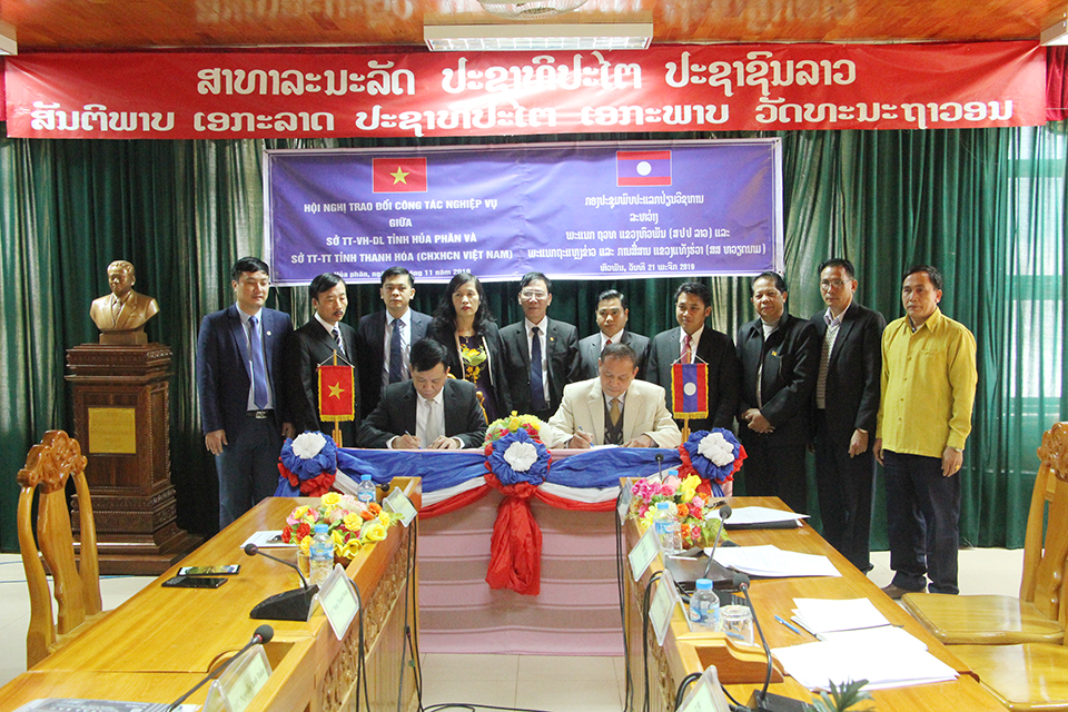 ວັນທີ 21 ພະຈິກ 2019, ພະແນກຖະແຫຼງຂ່າວ, ວັດທະນະທຳ ແລະທ່ອງທ່ຽວແຂວງຫົວພັນແຫ່ງ ສປປ ລາວ ແລະ ພະແນກຖະແຫຼງຂ່າວ ແລະ ການສື່ສານແຂວງແທັງຮວ່າແຫ່ງ ສສ ຫວຽດນາມ ໄດ້ຈັດກອງປະຊຸມພົບປະແລກປ່ຽນບົດຮຽນດ້ານວິຊາການສື່ມວນຊົນຂື້ນຢູ່ຫໍວັດທະນະທຳແຂວງຫົວພັນ, ໂດຍມີທ່ານ ຄຳສິງ ລາດດາ ວົງ ຫົວໜ້າພະແນກຖະແຫຼງຂ່າວ, ວັດທະນະທຳ ແລະ ທ່ອງທ່ຽວ ແຂວງຫົວພັນ ແລະ ທ່ານ ໂດ່ຮິວ ກວຽດ ຫົວໜ້າພະແນກຖະແຫຼງຂ່າວ ແລະ ການສື່ສານແຂວງແທັງ ຮວ່າ ພ້ອມດ້ວຍຄະນະທັງສອງຝ່າຍເຂົ້າຮ່ວມ.
