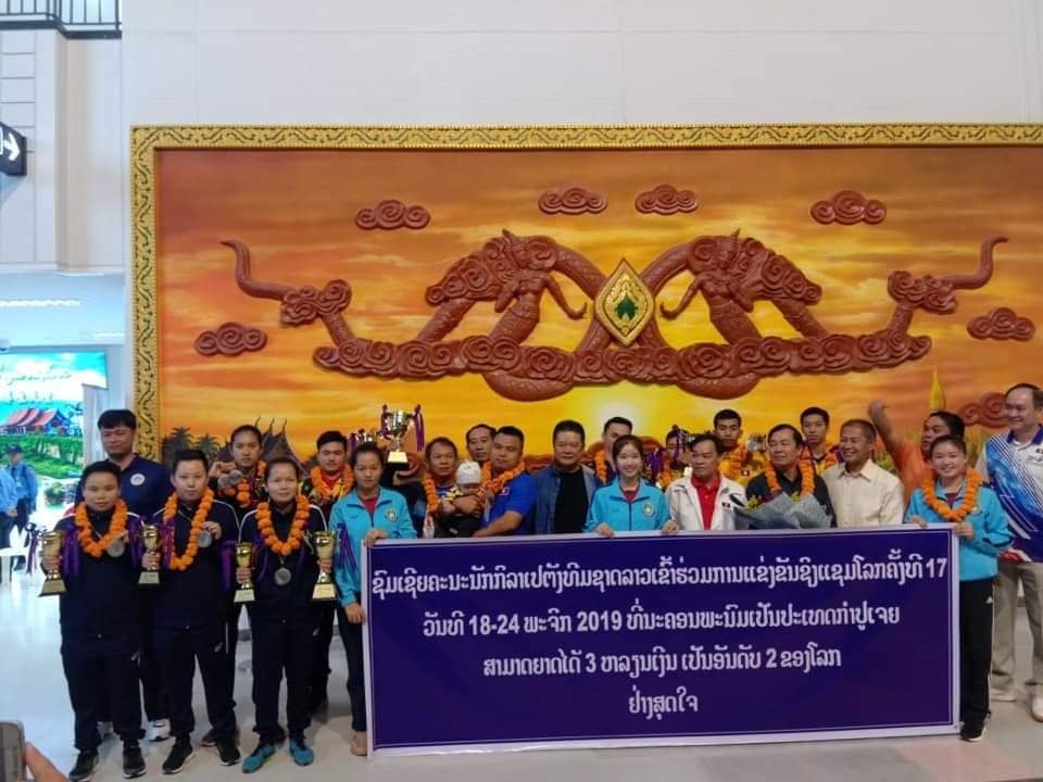 ທັບນັກກີລາເປຕັງທີມຊາດລາວທັງຮຸ່ນເຍົາວະຊົນ ແລະຊາວໜຸ່ມທົ່ວໄປຍິງຜູ້ທີ່ສ້າງຜົນງານຄັ້ງປະຫວັດສາດໃຫ້ວົງການກີລາລາວຄວ້າໄດ້ 3 ຫຼຽນເງິນໃນການແຂ່ງຂັນເປຕັງຊີງແຊັມໂລກຄັ້ງທີ XVll ທີ່ນະຄອນຫຼວງພະນົມເປັນປະເທດກຳປູເຈຍລະຫວ່າງວັນທີ 18-24 ພະຈິກ ຜ່ານມາໄດ້ເດີນທາງກັບມາເຖິງຖິ່ນຖານບ້ານເກີດເປັນທີ່ຮຽບຮ້ອຍແລ້ວພ້ອມທັງຖືກຕ້ອນຮັບຈາກຄະນະນຳກົມກີລາລະດັບສູງ, ສະຫະພັນກິີລາ ເປຕັງແຫ່ງຊາດ ແລະພໍ່ແມ່ປະຊາຊົນຊາວລາວຢ່າງອົບອຸ່ນ.